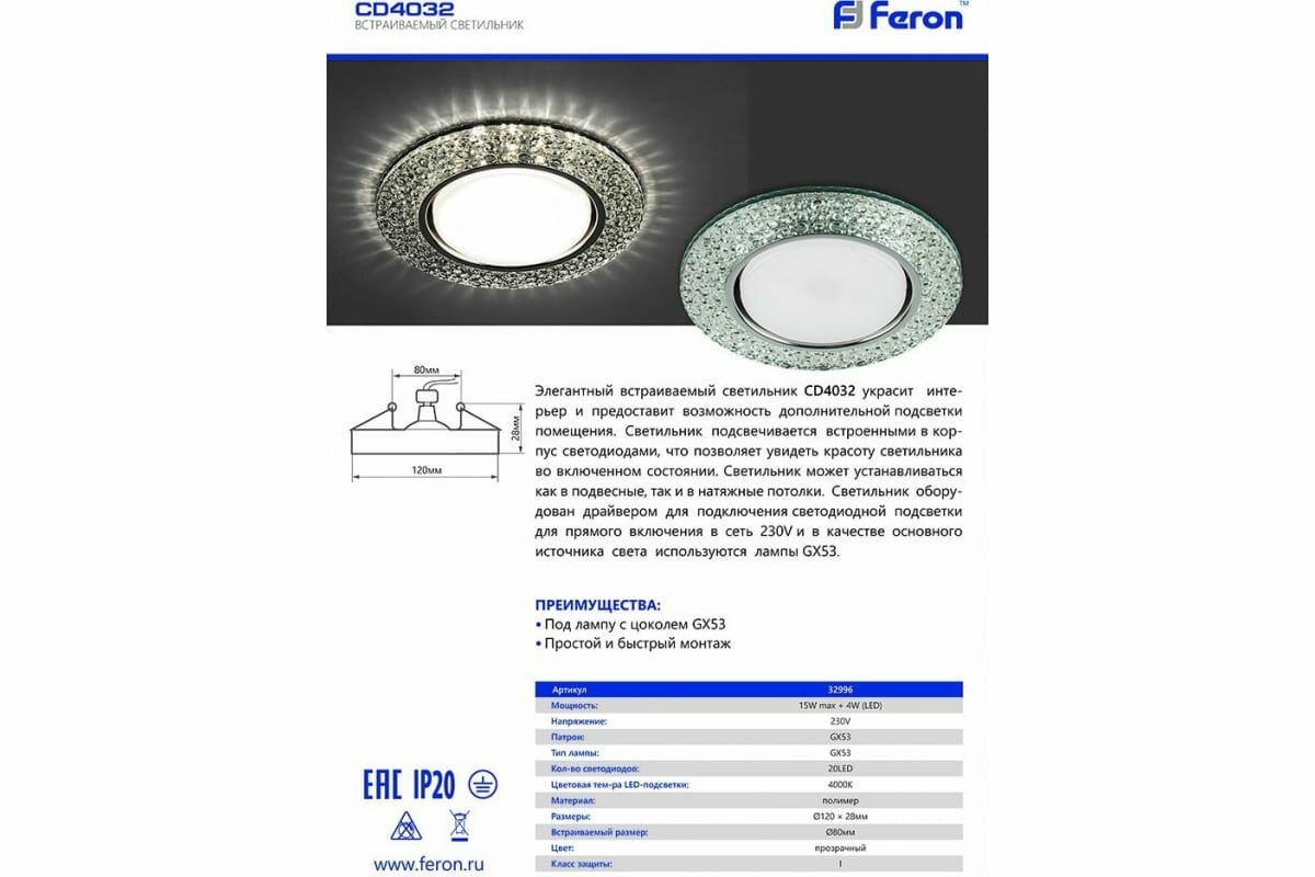 На сегодняшний день товар «Светильник встраиваемый с белой LED подсветкой Feron CD4032 потолочный GX53 без лампы прозрачный хром 32996» можно купить с кешбеком в 1 магазине: Яндекс.Маркет