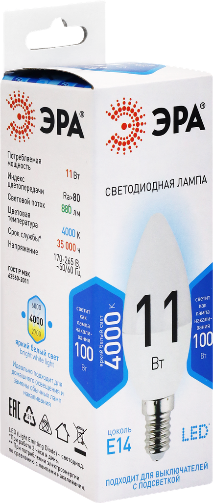 Экономичная светодиодная лампа ЭРА Серии Стандарт с отличными характеристиками для установки в люстры и все типы бытовых светильников - потолочные, настольные, бра. Бережёт электроэнергию, ярко светит, имеет долгий срок службы. Цветовая температура - холодный белый свет. Такое освещение бодрит, повышает работоспособность. Этот современный источник света создаёт комфортное и безопасное для глаз освещение.