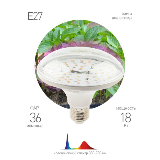 Фитолампа красно-синего спектра FITO-18W-RB-E27 бренда ЭРА поможет Вам вырастить свежие овощи! Достаточно расположить светильник на расстоянии 5-25 см от верхушек растений. Прекрасно подойдет для всех корнеплодов, в том числе редиса. Также для капусты и зелени, рассады пасленовых. Благодаря энергии красно-синего спектра ростки смогут получить все необходимые вещества для быстрого роста. Кроме того, ускоряются фотобиологические процессы, увеличивается выработка сахаров. Корпус выполнен из алюминия. Обладает хорошим теплоотводом, минимизирует нагрев светодиодов. Прозрачный рассеиватель сохраняет световой поток по сравнению с матовым на 30-60%. Фитосветильник с такой лампой можно применять не только для рассады, но и для взрослых растений. Отсутствие пульсаций не раздражает глаза. Цветовая температура 2370 К подарит приятное свечение.Светильник для растений ЭРА правильный выбор для Ваших растений!