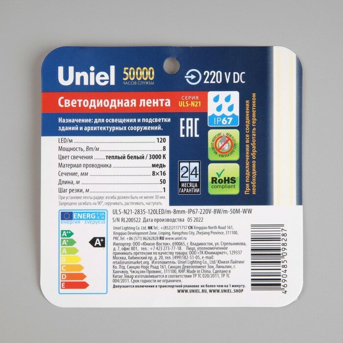 Светодиодная влагозащищенная лента ULS-N21-2835-120LED/m-8mm-IP67-220V-8W/m-50M-WW из серии «ULS-N21 Flex» от производителя Uniel (Китай). Дизайн-стиль современный. Отлично подойдет для такого типа помещений, как баня и сауна. Цвет товара белый. С учетом технических характеристик мощности хватит для освещения 22.3 м2. Цоколь LED. Вид ламп: светодиодная. Количество ламп 6000 шт. Мощность одной лампы составляет 0.067 Вт. Общая мощность 402 Вт. Напряжение 220-240 Вольт. Поток света 9000 Люмен. Уровень защищенности от влаги и пыли IP67. Заявленный производителем срок работы 30000 часов. Расширенная гарантия на товар 2 года. Длина 50000 мм. Ширина 8 мм. Высота 16 мм. Вес товара 6.7 кг. Комплектация: Светодиодная влагозащищенная лента. Инструкция по сборке/использованию. Детали, необходимые для сборки товара. Лампочки входят в комплект.Товар упакован в картонную коробку. В случае доставки транспортными службами или маркетплейсом добавляются дополнительные элементы упаковки для защиты от повреждений при транспортировке - усиление картоном, внутренний наполнитель, стрейч-пленка.