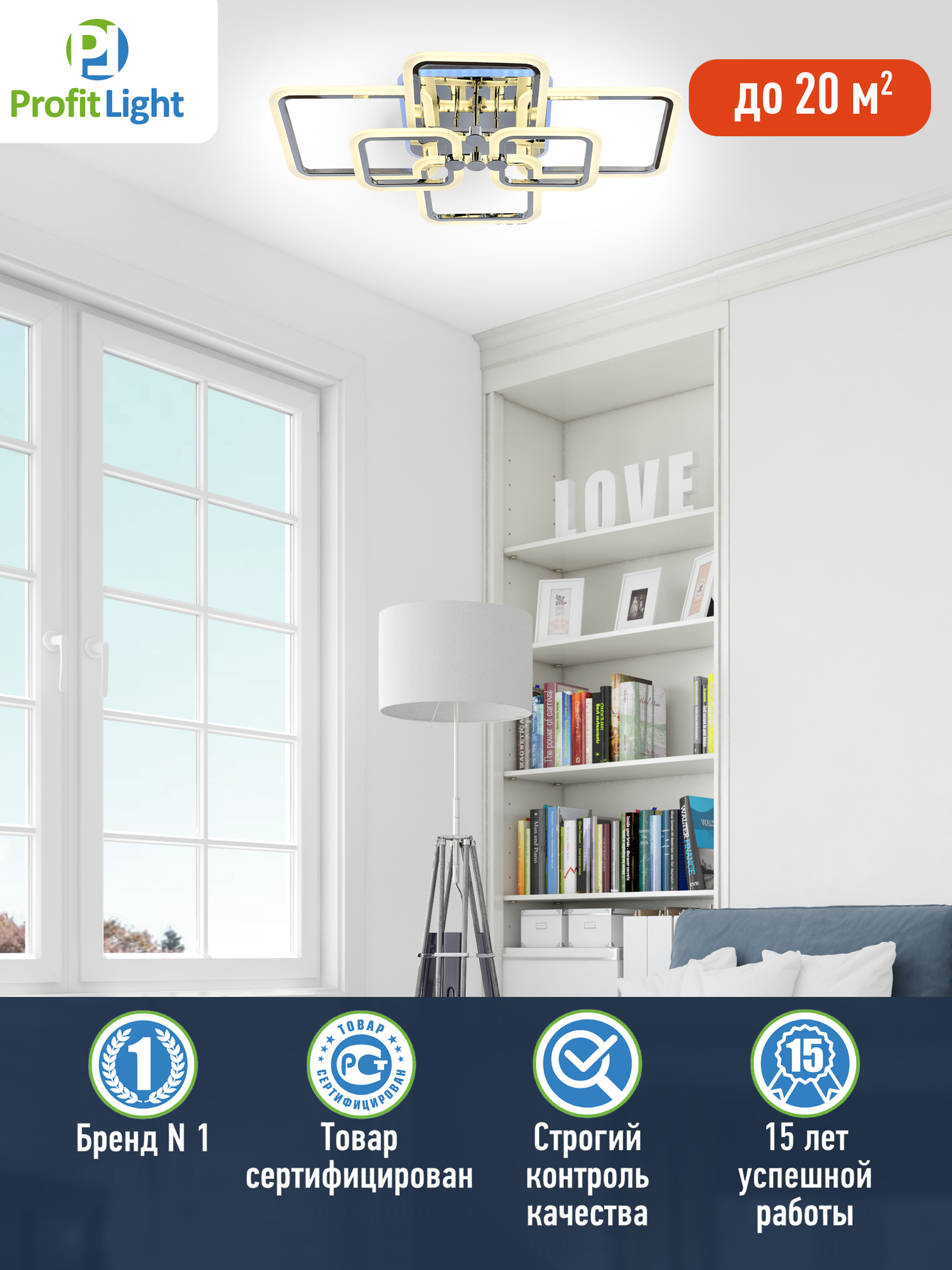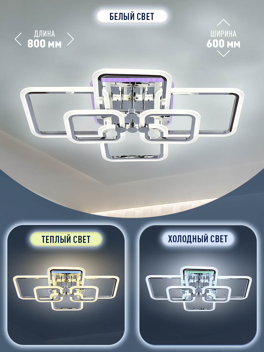 Потолочная светодиодная люстра Profit Light 18070/6 CHR 196W+10W диммируемая с ПДУ подходит для установки в помещениях площадью до 20 квадратных метров.