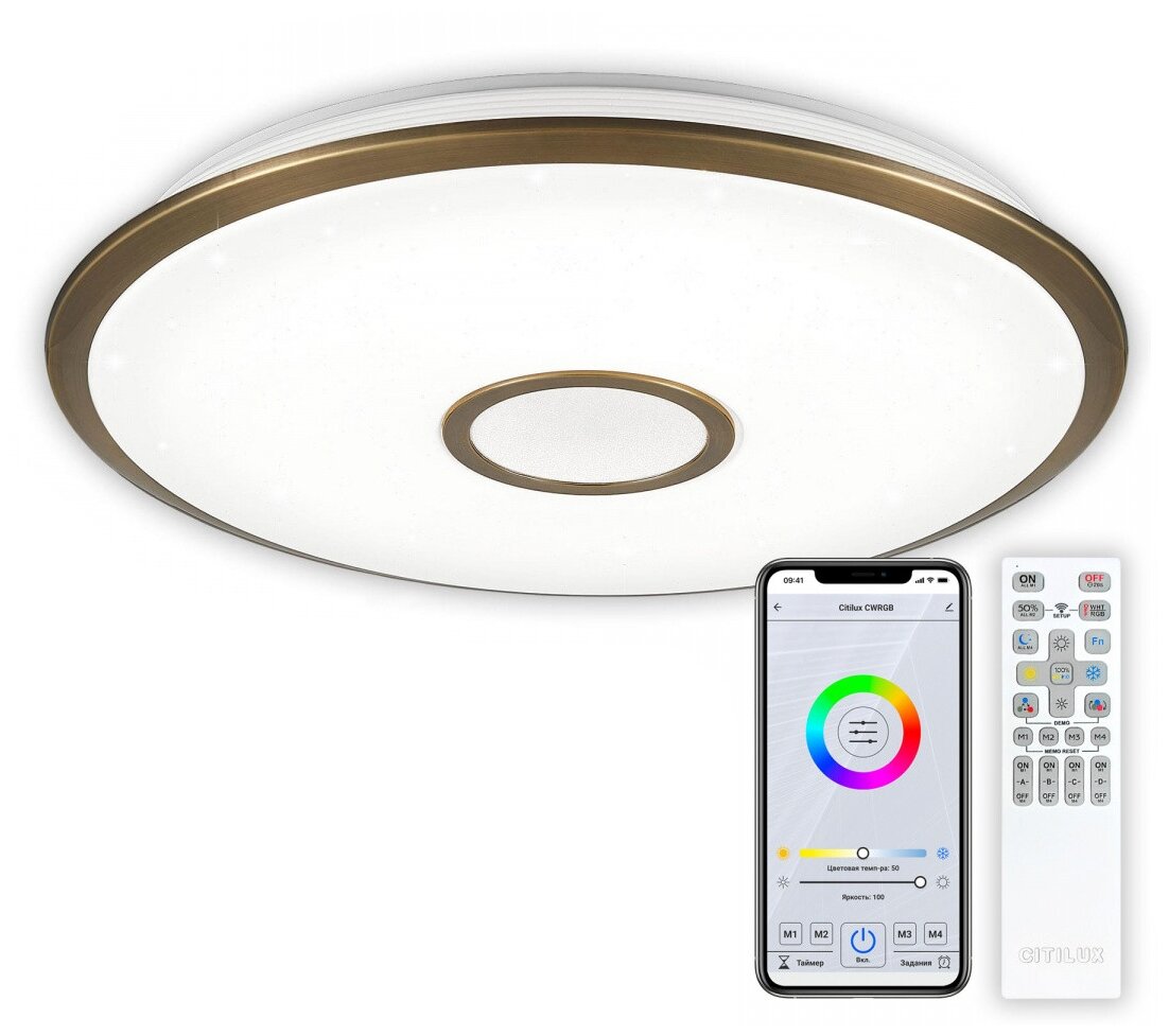 Потолочный светильник светодиодный с пультом и управлением смартфоном регулировкой яркости и цветовой температуры таймером Старлайт Смарт CL703A81G RGB - продукт известной компании Citilux (Италия). Имеет максимальную мощность 90 Вт, освещает площадь до 26 кв. м. Отлично подойдет для таких мест, как гостиная, спальня. Впишется в интерьеры следующих стилей: современный.