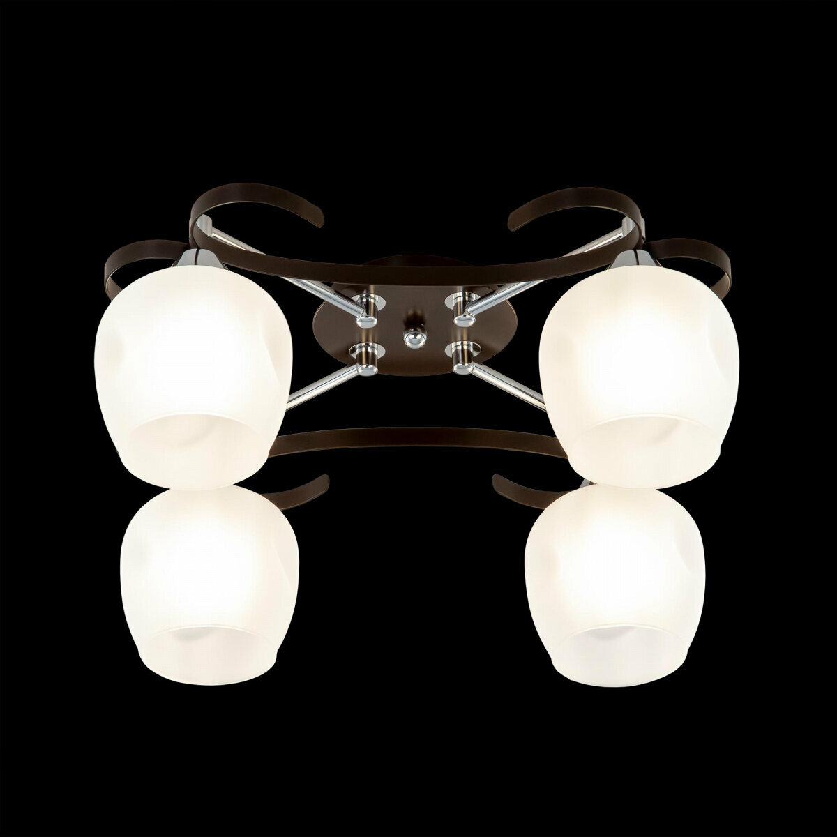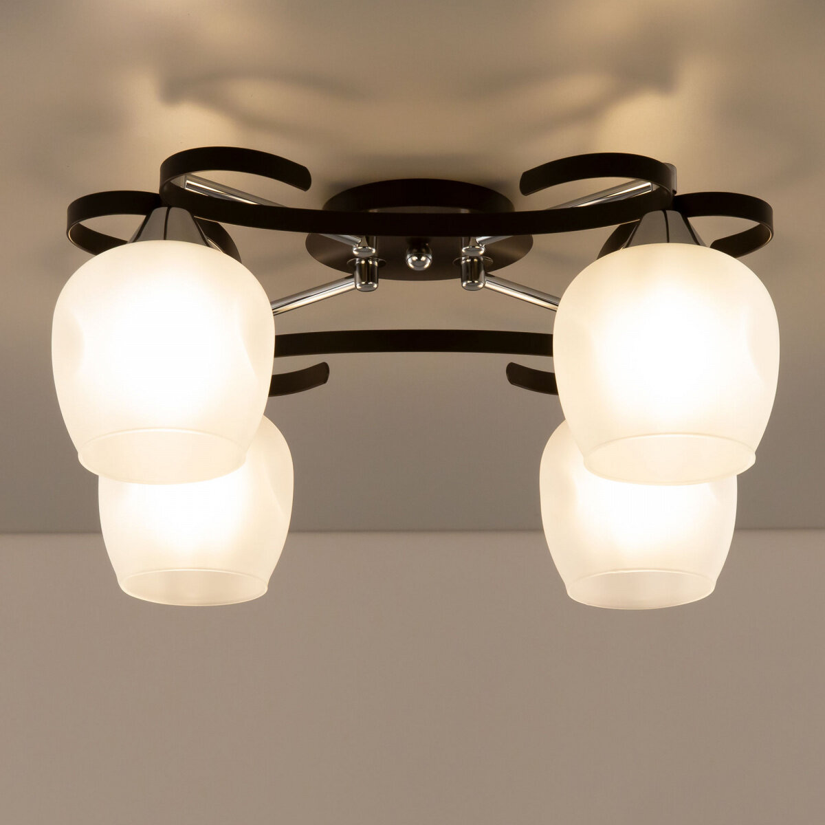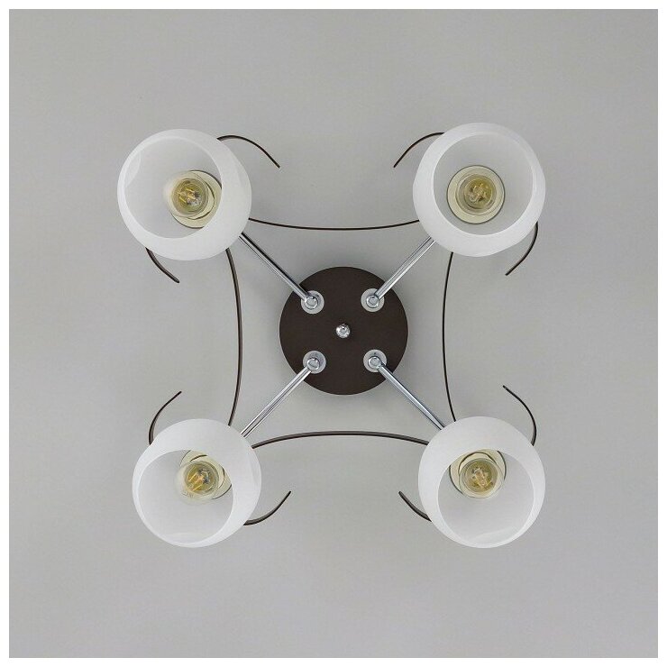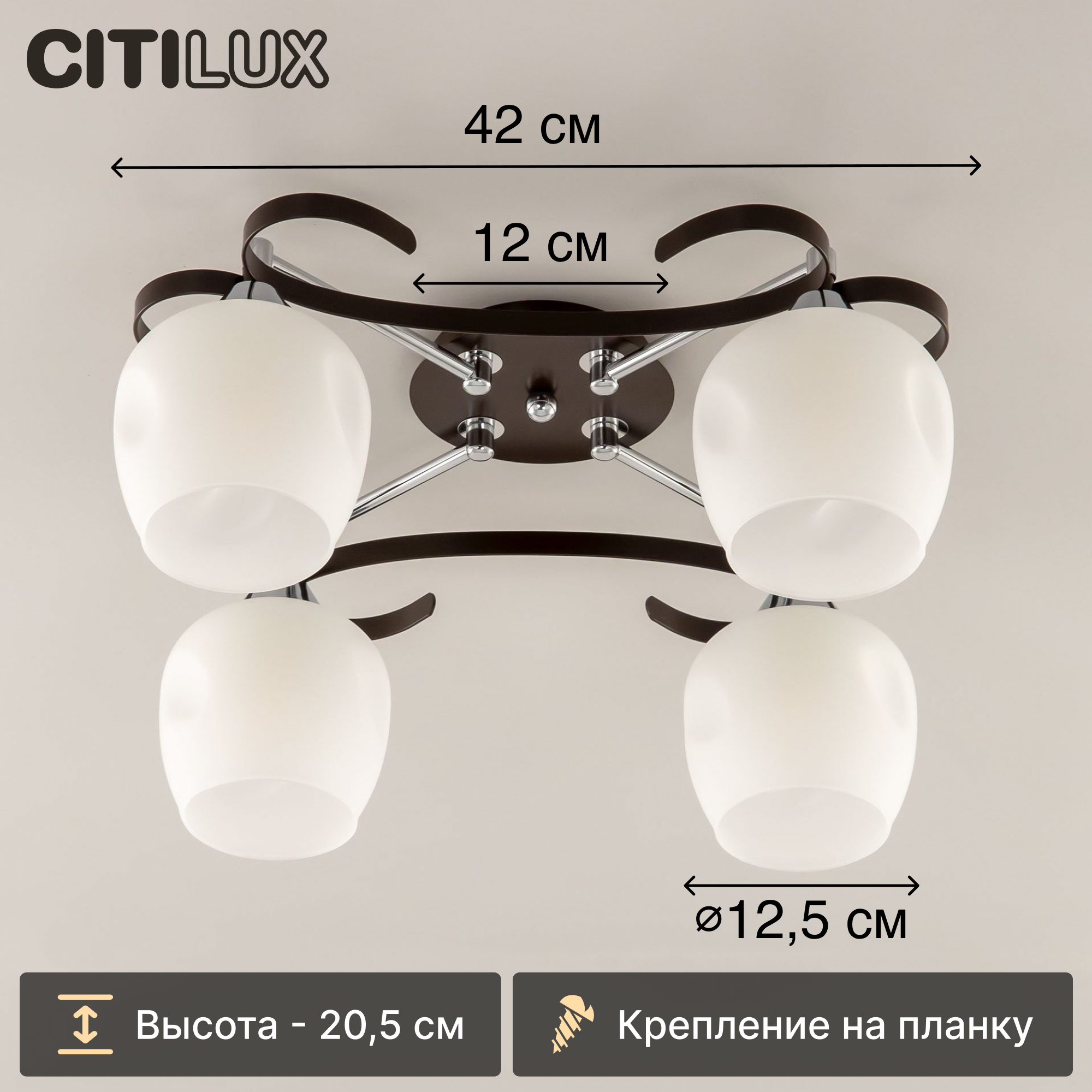 Люстра четырёхрожковая Citilux Сюзи CL171144 выполнена в современном стиле. Корпус светильника металлический, цвет венге, с декоративными хромированными элементами. Плафоны стеклянные, полуматовые, необычной формы. Модель потолочная, тип крепления – планка. Может работать как с одноклавишным, так и с двухклавишным выключателем. В изделии используются 4 лампы с цоколем Е27 и максимальной мощностью для ламп накаливания 75Вт, светодиодные лампы можно использовать более яркие.