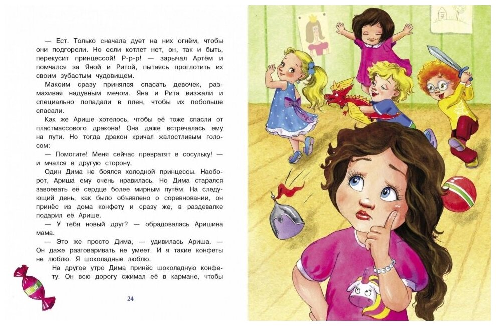 Ариша росла как настоящая принцесса, всё у неё было самое лучшее - самые красивые игрушки, самые нарядные платья. Только друзей у Ариши не было. А всё потому, что в ней сидела маленькая и вредная воображуля! И вот однажды пришла Ариша в детский садик и оказалось, что там и без нее много принцесс. Воспитательница даже соревнование устроила, чтобы выбрать из всех принцесс - лучшую! Придётся Арише хорошенько постараться и многому научиться. Но всё не так страшно, когда рядом верный лопоухий рыцарь...