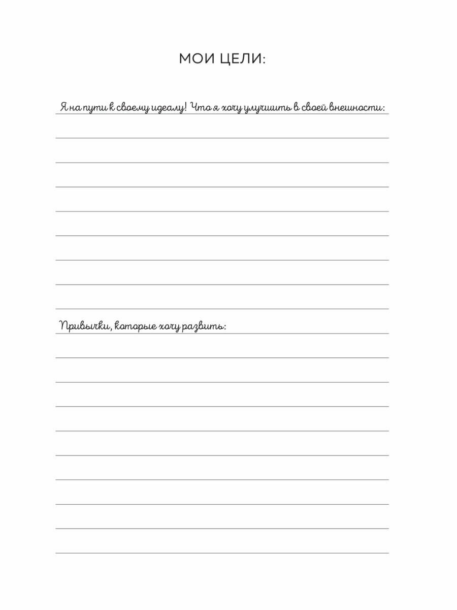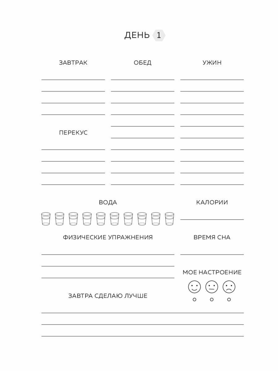 Этот дневник питания и упражнений станет настоящим помощником в достижении отличного самочувствия и красивой фигуры. А также будет мотивировать вас ставить правильные цели и достигать их. С ним вы сможете отслеживать правильность рациона, потребление воды, физическую активность, вес, сон и настроение.