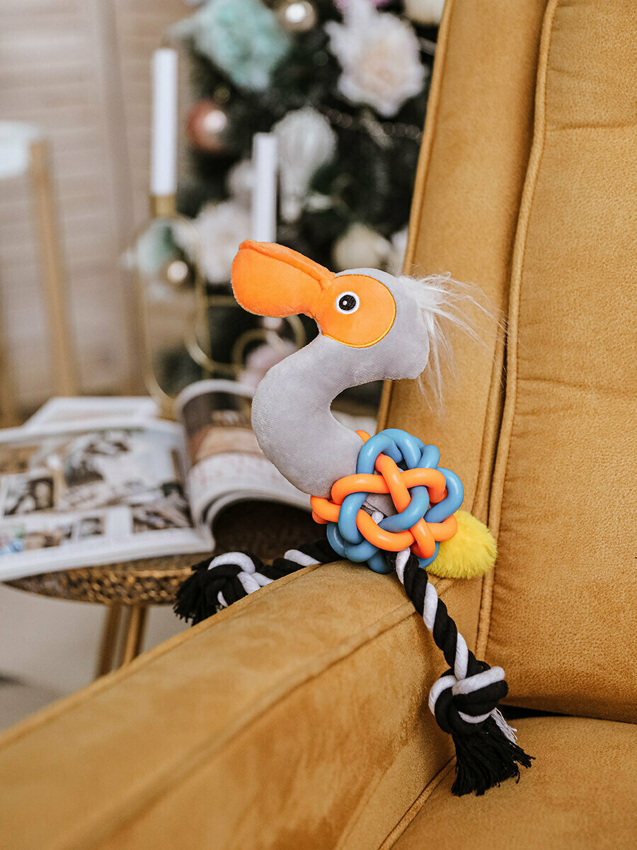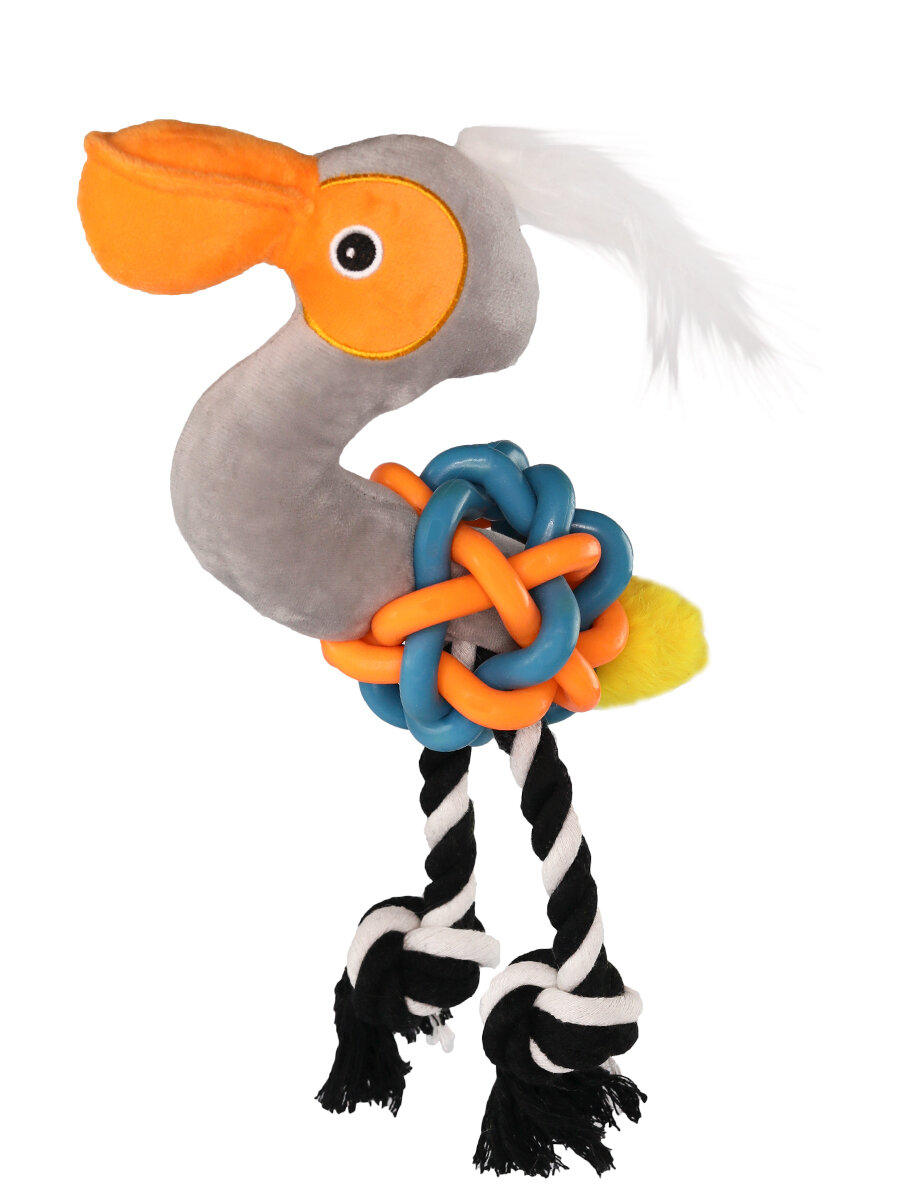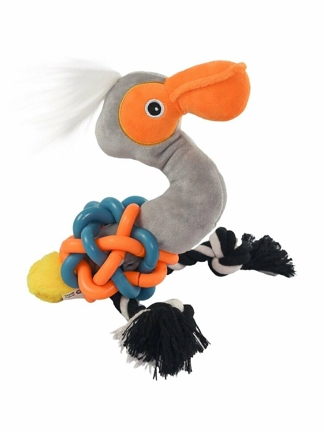Игрушка для животного в виде пеликана. Игрушка выполнена из мягкого и приятного материала, тело обмотано экстрапрочными резиновыми жгутами, ножки -канатики. Размер изделия - 39х22х5 см.