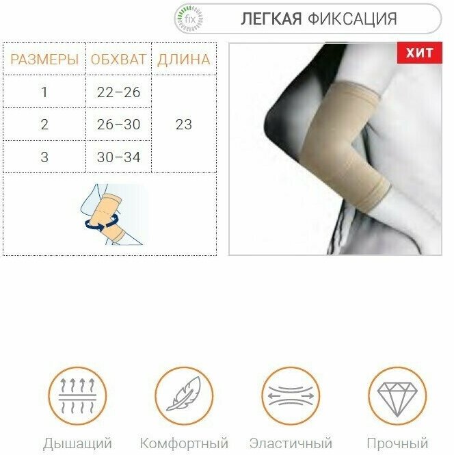 Действие: Легкая фиксация локтевого сустава. Основные преимущества: В области локтевого сустава вставка из перфорированного неопрена оказывает локальный защитный и термо-компрессионый эффект. Материал не теряет ортопедические свойства даже после многократных стирок. Показания: Эпикондилит начальной стадии, "локоть гольфиста", "синдром теннисиста" Легкая нестабильность / гипермобильность. Реабилитация после травм и операций. Профилактика травм, в т. ч. спортивных. Как определить размер Измерьте обхват локтевого сустава.