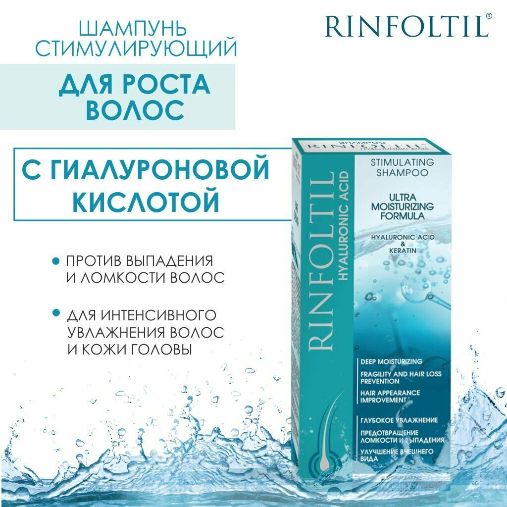 «РИНФОЛТИЛ ГИАЛУРОНОВАЯ КИСЛОТА» шампунь для волос без сульфатов с кератином и гиалуронатом натрия, бережно очищает, глубоко увлажняет кожу головы и волосы, не нарушая их естественный защитный барьер, активирует рост волос, эффективен против выпадения волос. Действие шампуня достигается благодаря активным компонентам в его составе – гиалуроновой кислоте, кератину и соку алоэ. Шампунь подходит для всех типов волос, особенно тонких, ослабленных, ломких и поврежденных. При регулярном применении шампунь восстанавливает и укрепляет структуру волос, выравнивает их поверхность и предотвращает ломкость, придает блеск и сияние. Волосы становятся гладкими, эластичными, хорошо укладываются. Для максимального эффекта в уходе за волосами рекомендуется сочетать шампунь с лосьонами и сыворотками РИНФОЛТИЛ.