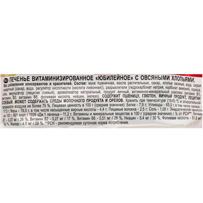 | Состав | Мука пшеничная, масла растительные, сахар, хлопья овсяные, вода, сироп инвертный (сахар, вода, регулятор кислотности (кислота лимонная)), разрыхлитель (гидрокарбонат натрия, карбонат аммония), корица, соль, эмульгатор (лецитин соевый), ароматизатор натуральный, продукт яичный, витаминно-минеральный комплекс (витамин В1, витамин В2, витамин В6, фолиевая кислота, ниацин, железо). |