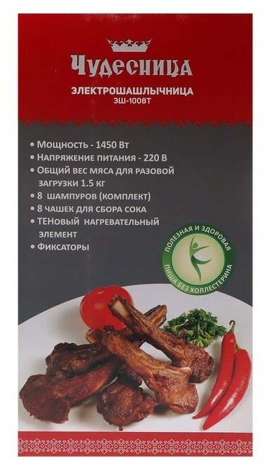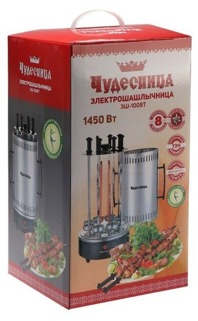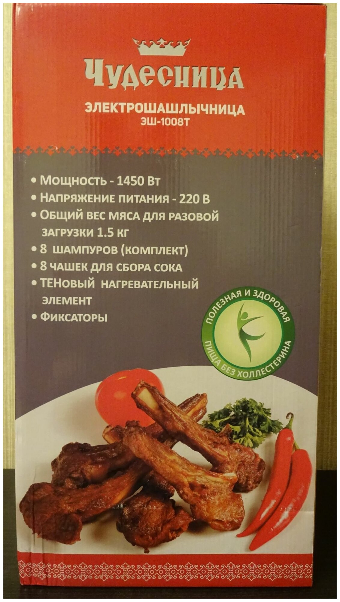 Электрошашлычница Чудесница ЭШ-1008 отличается высокой мощностью работы в 1450 Вт, что позволяет ей максимально быстро справиться с обжаркой мяса. Прибор рассчитан на 8 шампуров. Предусмотрены специальные емкости для сбора жира, которые не только сделают ваш шашлык сочным, но и значительно упростят процесс последующего ухода за устройством. Нагревательный элемент модели Чудесница ЭШ-1008 расположен по центру, что незаменимо для равномерного распределения тепла. Корпус выполнен из пластика и нержавеющей стали – материалов, которые с легкостью очищаются от накопившихся в процессе эксплуатации загрязнений.
