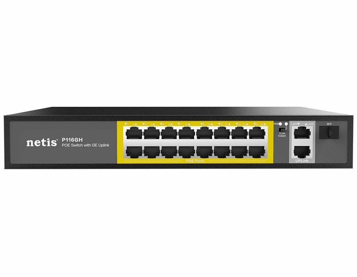 | Прочие особенности и свойства | Коммутатор netis P116GH имеет 16 портов 100 Мбит/с с поддержкой POE (Power over Ethernet), предоставляющих и данные, и питание, 2 порта 1000 Мбит/с для подключения к сети или другим устройствам посредством RJ45 и 1 порт SFP Uplink, максимальная мощность одного порта - 30 Вт, максимальный бюджет PoE коммутатора - 240 Вт. Коммутатор поддерживает функцию Watchdog - автоматическую детекцию зависшего оборудования и перезагрузку питания PoE на порту а также режим передачи PoE на расстояние до 250 метров. |