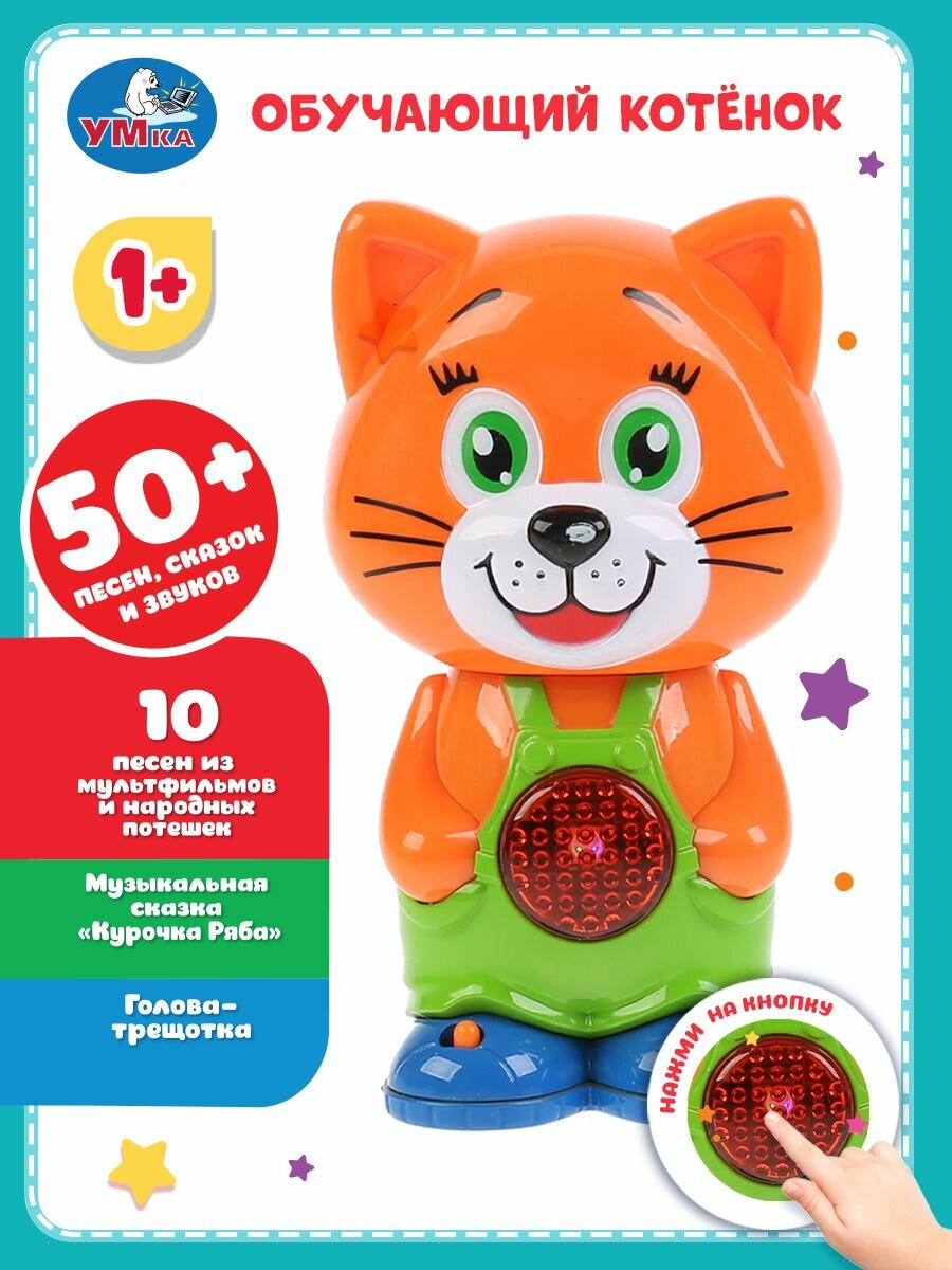 Вашего малыша приведёт в восторг эта игрушка в виде забавного котёнка с подвижной головой, издающей звук трещотки. Ребёнок с удовольствием будет играть с этой игрушкой, слушать весёлые песенки и потешки, а также любимую сказку про Курочку Рябу.