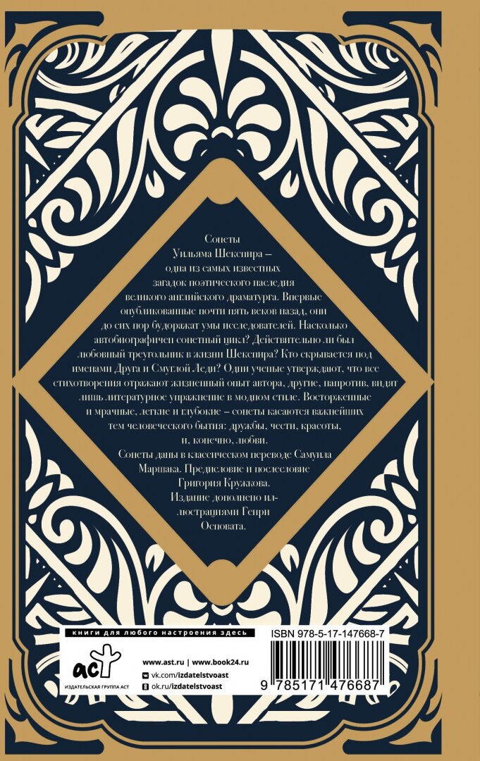 Моё любимое издание сонетов Шекспира на русском! Признаюсь, что в глубине души я больше даже люблю русский перевод Маршака, всё-таки он умеет запасть в душу) Качество печати достойное, хорошее, нет такого, что чернила смазываются, когда проводишь по тексту пальцем. Прекрасный слог, увлекательный текст, красивая и привлекательная обложка! Очень и очень люблю эту версию и советую всем