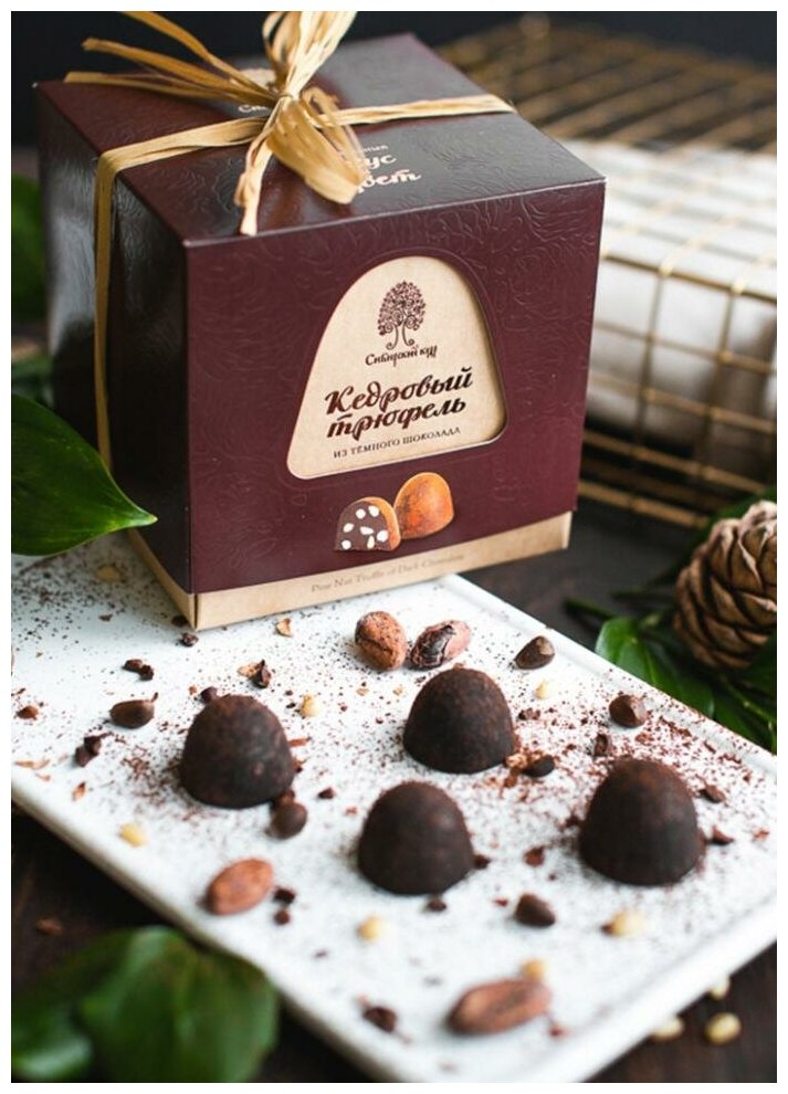 Кедровый трюфель — давно полюбившиеся всем конфеты. Мы раздвинули границы возможного и добавили к европейским шоколадным традициям яркий вкус сибирских ягод и орехов. Нежная текстура мягкого бельгийского шоколада выразительно подчёркнута вкусом свежего кедрового ореха. Особенно его оценят знатоки и ценители классического тёмного шоколада. Состав: шоколадная масса (какао-масло, какао тёртое, тростниковый сахар, эмульгатор лецитин, ваниль натуральная), ядро кедрового ореха цельное, масло кокосовое, какао-порошок. Энергетическая ценность: 740 ккал | 2 930 кДж Пищевая ценность на 100 грамм продукта: белки: 6 г жиры: 68 г углеводы: 25 г Срок годности: 6 месяцев. Вес: 120 грамм. Количество: 12 конфет.