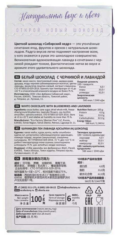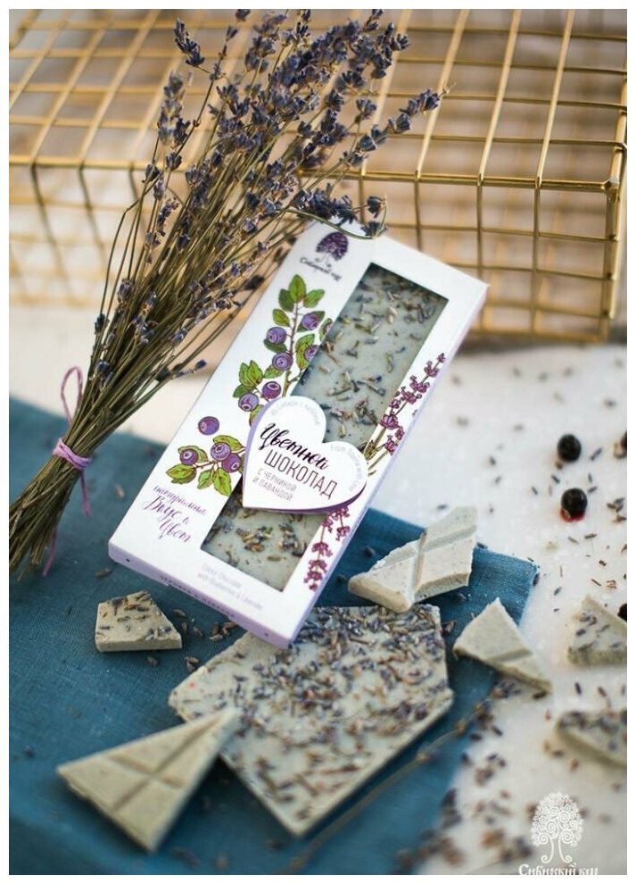 | Состав | какао масло, тростниковый сахар, молоко сухое цельное, черника сублимированная молотая, цветки лаванды, лецитин соевый (эмульгатор), экстракт спирулины |