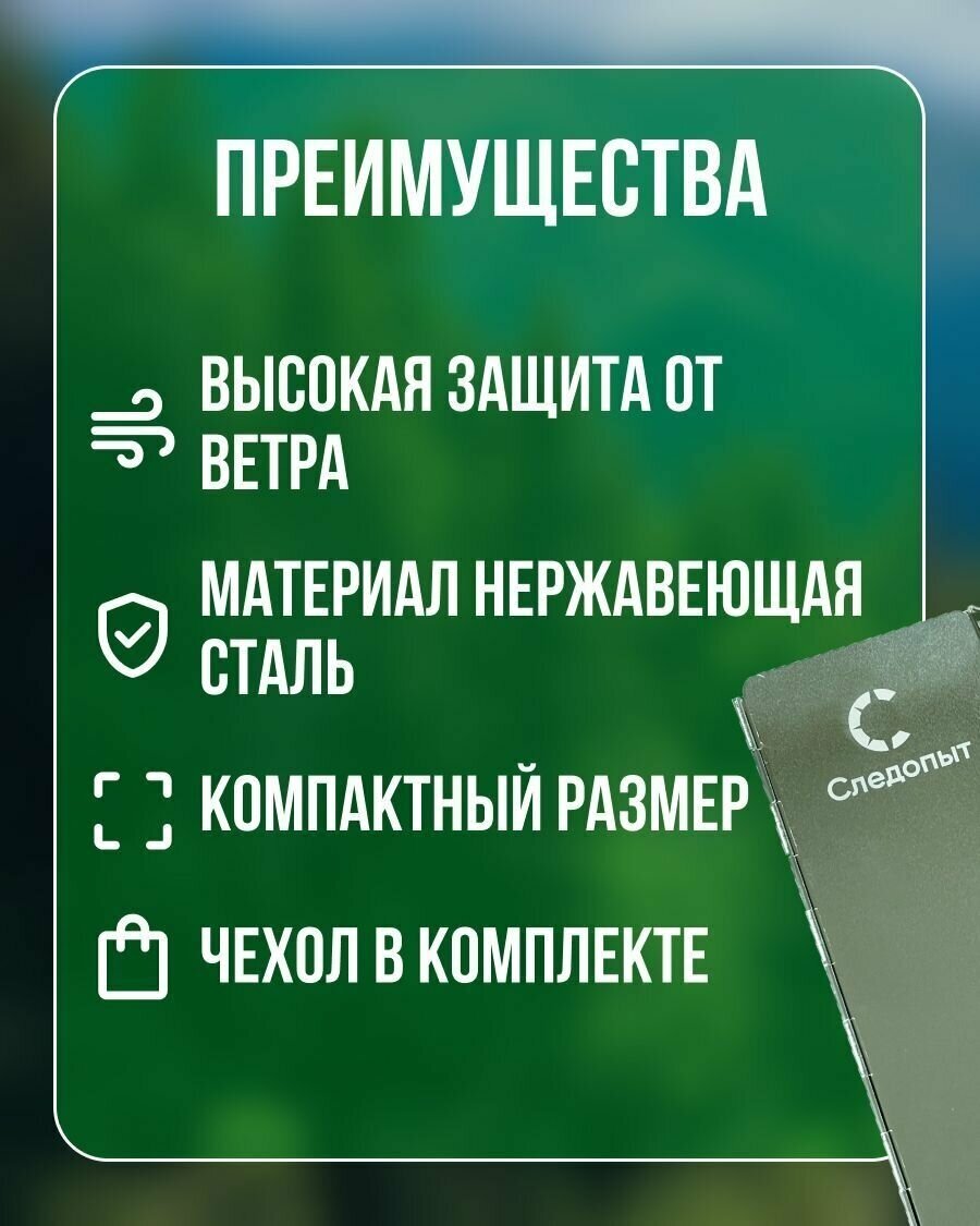 Небольние размеры и вес.Поставляется в защитной пленке. Благодаря 8-секционной конструкции в сложенном виде размеры экрана составляют 85*240 мм., вес чуть больше 200 гр. Крайние секции имеют выдвижные штыри-опоры для прочной фиксации экрана на земле. В разложенном вокруг горелки состоянии, экран образует круг диаметром порядка ~20-23 сантиметров. Для удобства транспортировки и хранения есть простой но практичный матерчатый чехол с логотипом-надписью "Следопыт" (как и на первой секции экрана).