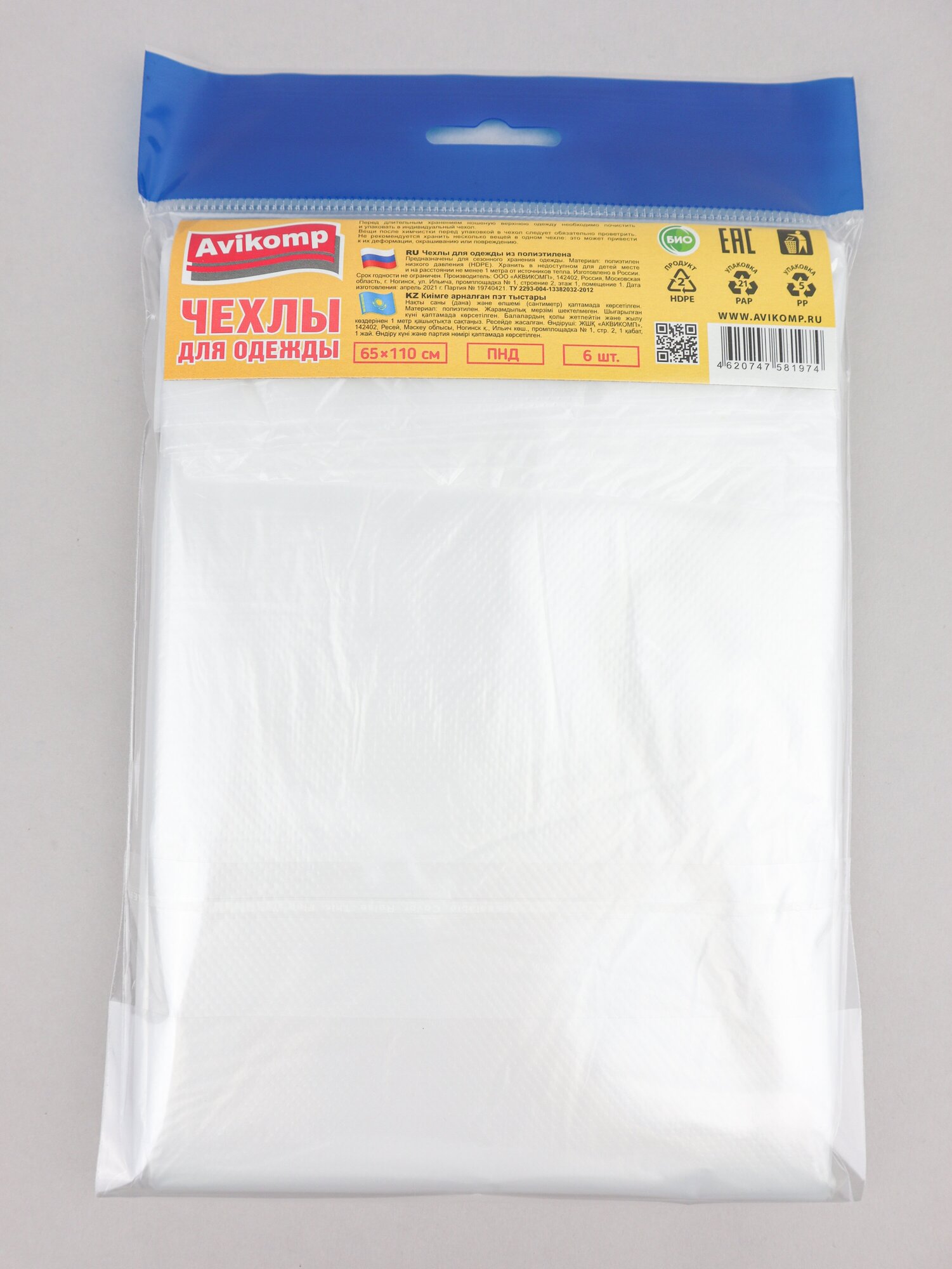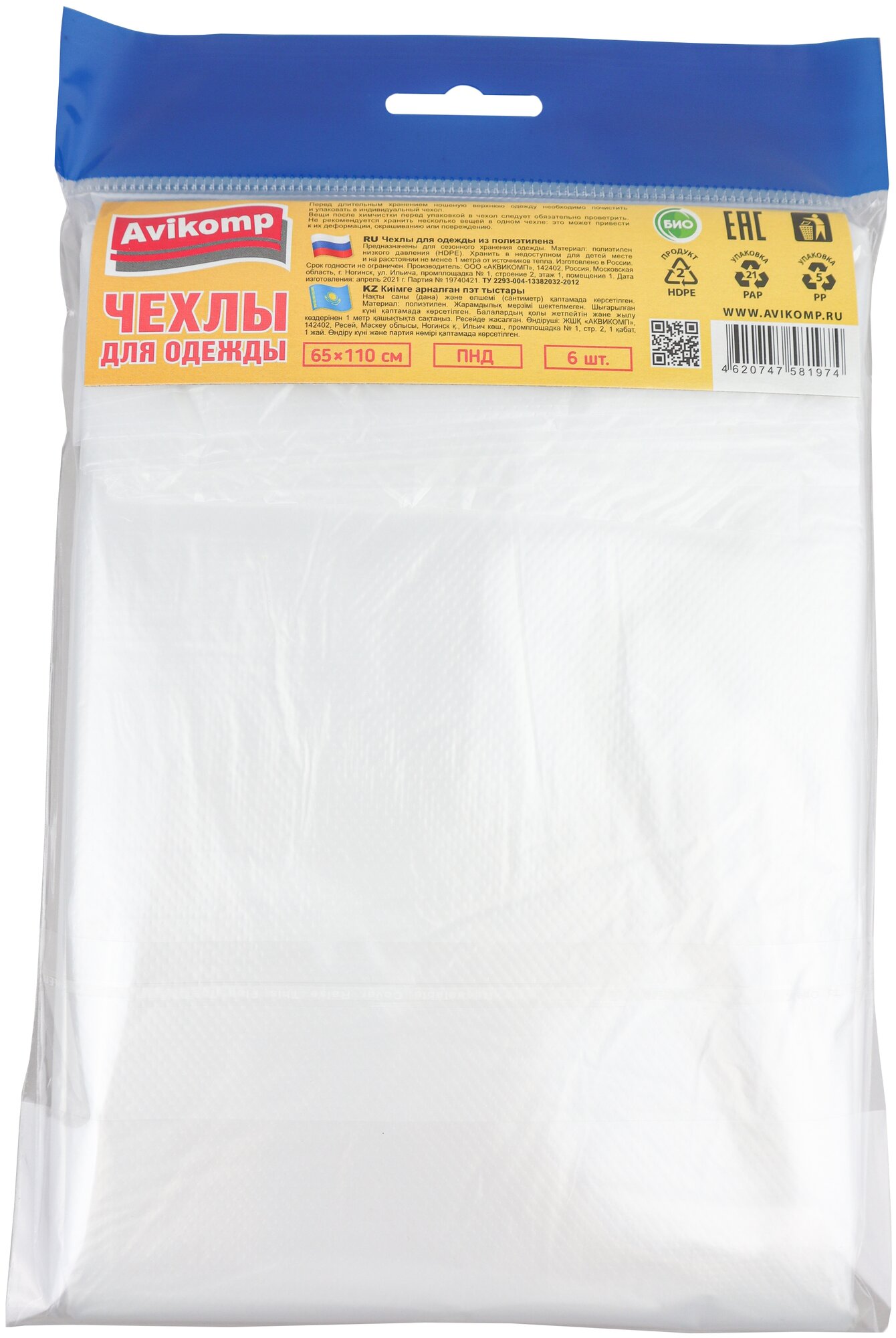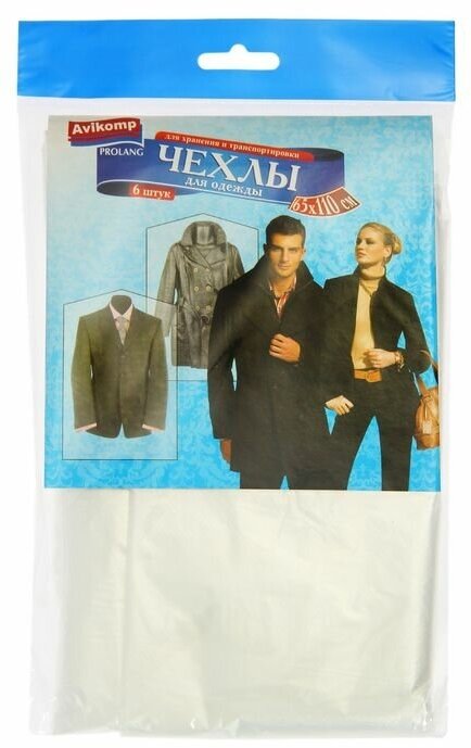 Полиэтиленовые чехлы для одежды - чехлы для одежды из полиэтилена в упаковке по 6 штук выпускаются под новой торговой маркой и с новым дизайном упаковки. Прозрачный чехол из плотного полиэтилена надежно защитит одежду от пыли, влаги и загрязнений, неизменно возникающих в процессе длительного хранения. Удобный размер 65*110 см. и не запаянный нижний шов позволят хранить в чехле любую одежду: костюм, пальто или длинное платье.