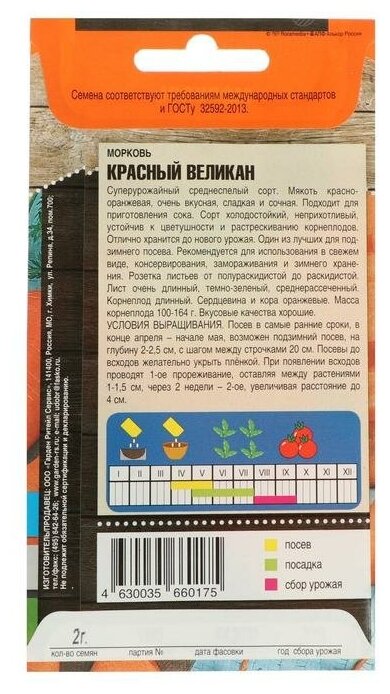 Откройте для себя удивительный мир садоводства с семенами моркови "Красный Великан" от Тимирязевского питомника. Эти семена подарят вам вкусные и сочные корнеплоды, которые станут настоящим украшением вашего огорода.