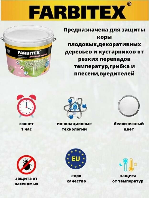 Краска для садовых деревьев FARBITEX предназначена для защиты коры плодовых, декоративных деревьев и кустарников от резких перепадов температур, грибка и плесени, вредителей. Продукт отличается экологичностью, образует паропроницаемое ?дышащее? декоративное покрытие.