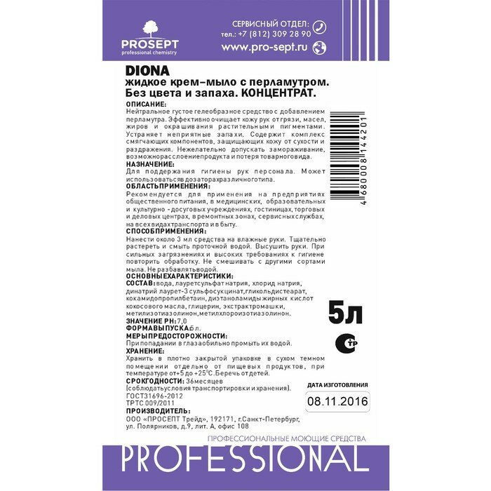 крем-мыло жидкое prosept diona концентрат без цвета без запаха с перламутром 5л 145-5