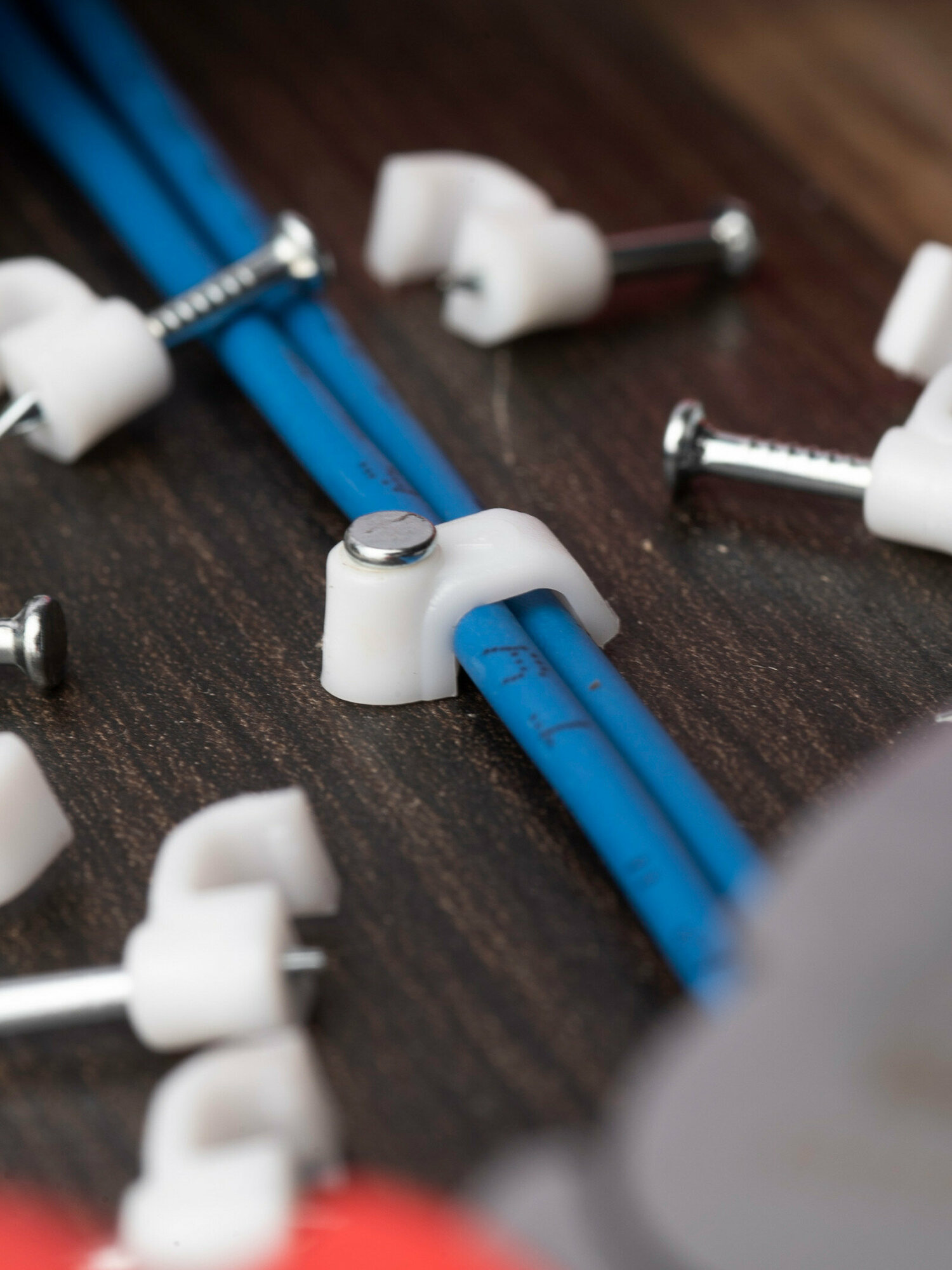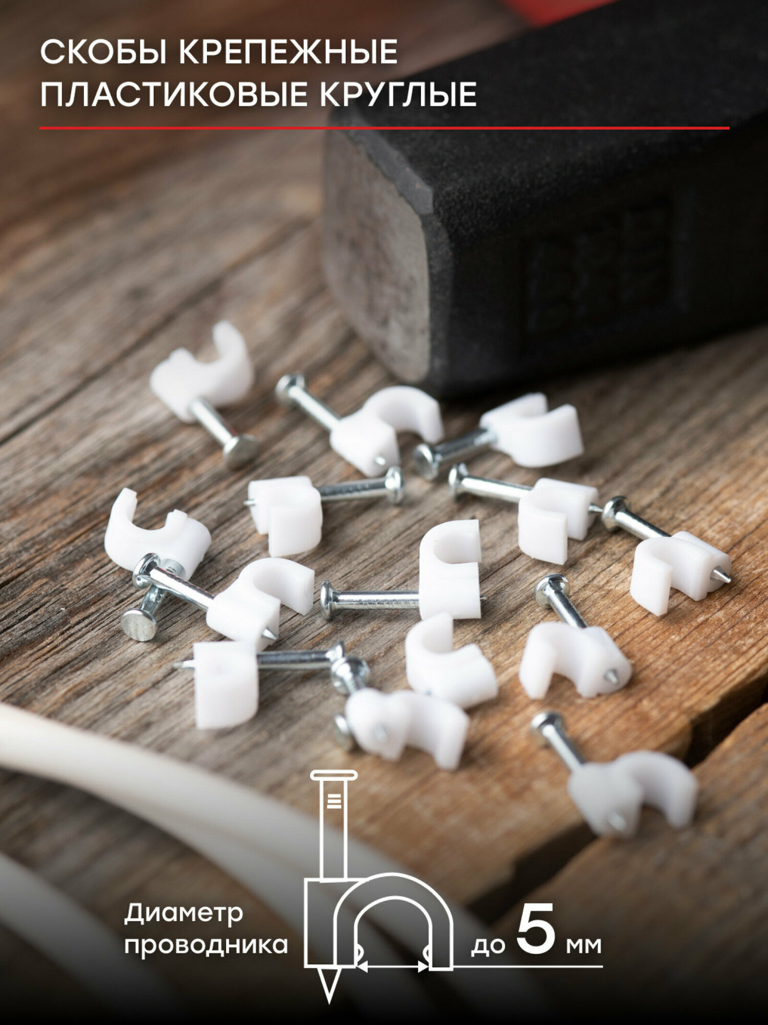 ОПИСАНИЕ. Предназначены для быстрого и надежного крепления круглых и плоских кабелей. Гибкий, негорючий, ударопрочный полипропилен. ПРЕИМУЩЕСТВА. Гвоздь: закаленная оцинкованная сталь, не подвержен коррозии. Надежное крепление. На каждой скобе указан типоразмер. Удобство хранения россыпью. Материал: полипропилен, самозатухающий, без галогенов. Поставляется в комплекте с уже вставленным гвоздем. ПРИМЕНЕНИЕ. Для быстрого монтажа проводов или кабелей в строениях жилого или промышленного назначения. Предназначены для быстрого и надежного крепления круглых и плоских кабелей.