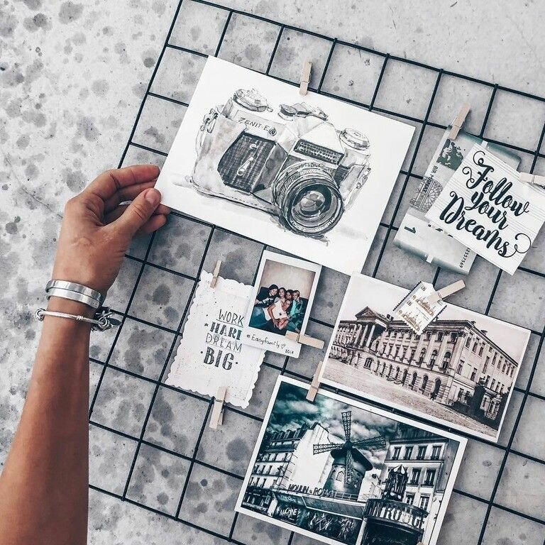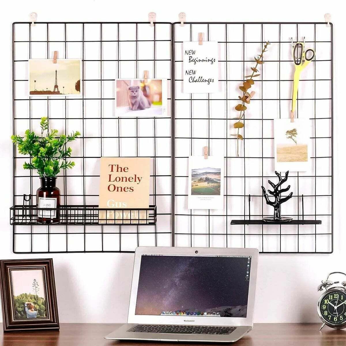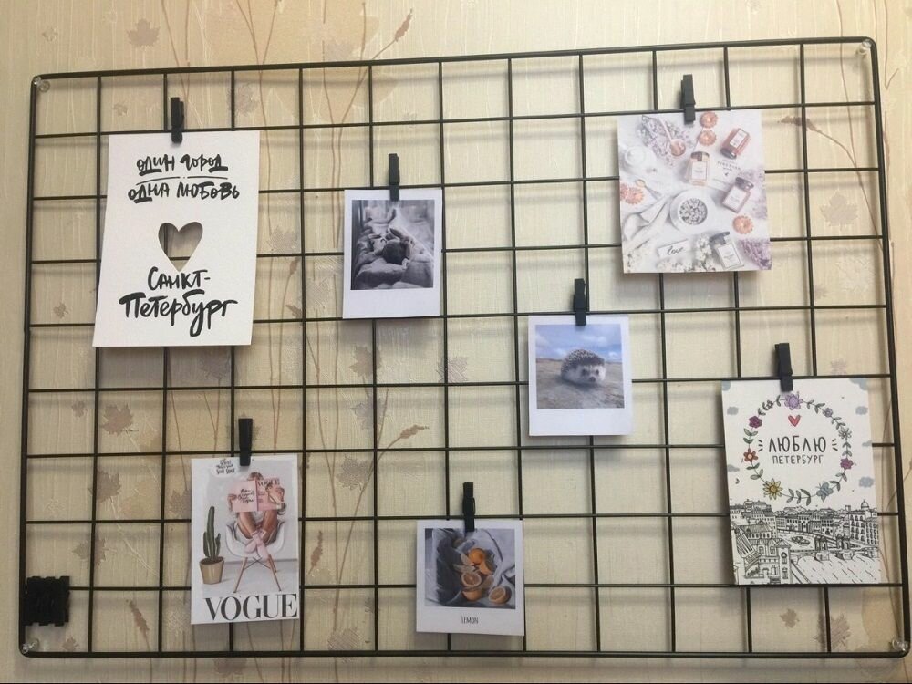 Металлическая сетка станет интересным фоном и удобным каркасом для размещения фотографий, открыток, записей. С помощью прищепок или веревочек вы сможете украсить ее небольшим декором.