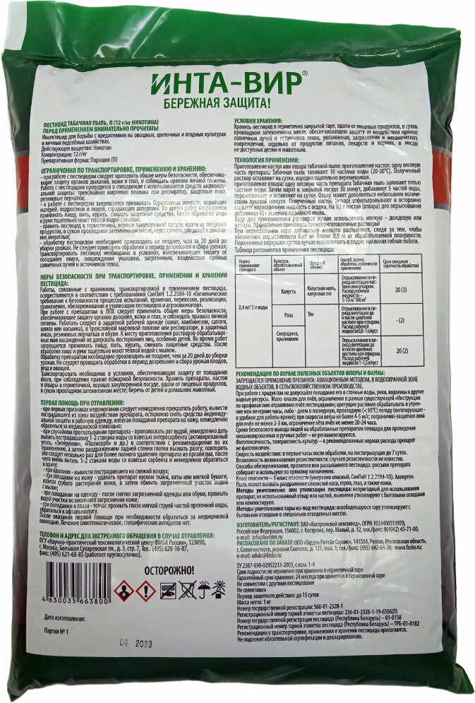 Опыливание растений в период вегетации против сосущих насекомых, блошек щитоносок, капустной и луковой мух и др. вредителей. В сухом виде табачную пыль смешивают с равным количеством золы и полученной смесью опыляют заражённые растения. При появлении блошек обрабатывать 2-3 раза через каждые 45 дней, против других вредителей через 6-8 суток, против слизней опыливать почву из расчёта 20-25 г на 1 кв. м. Против луковой мухи - 10 г смеси на 1 кв. м. 1 раз в начале лета, второй - июль- август.