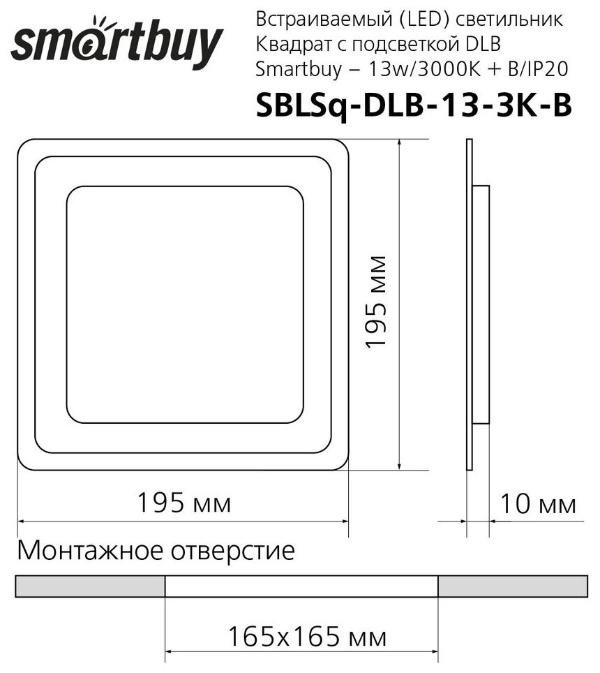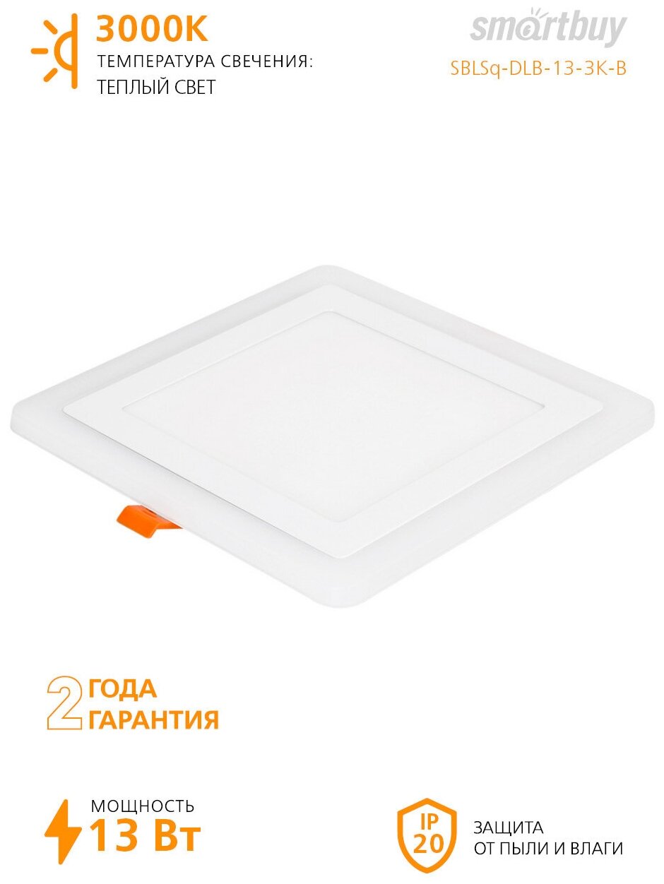 светильник светодиодный smartbuy 13вт 220в 3000к 1038лм 195мм ip20 sblsq-dlb-13-3k-b
