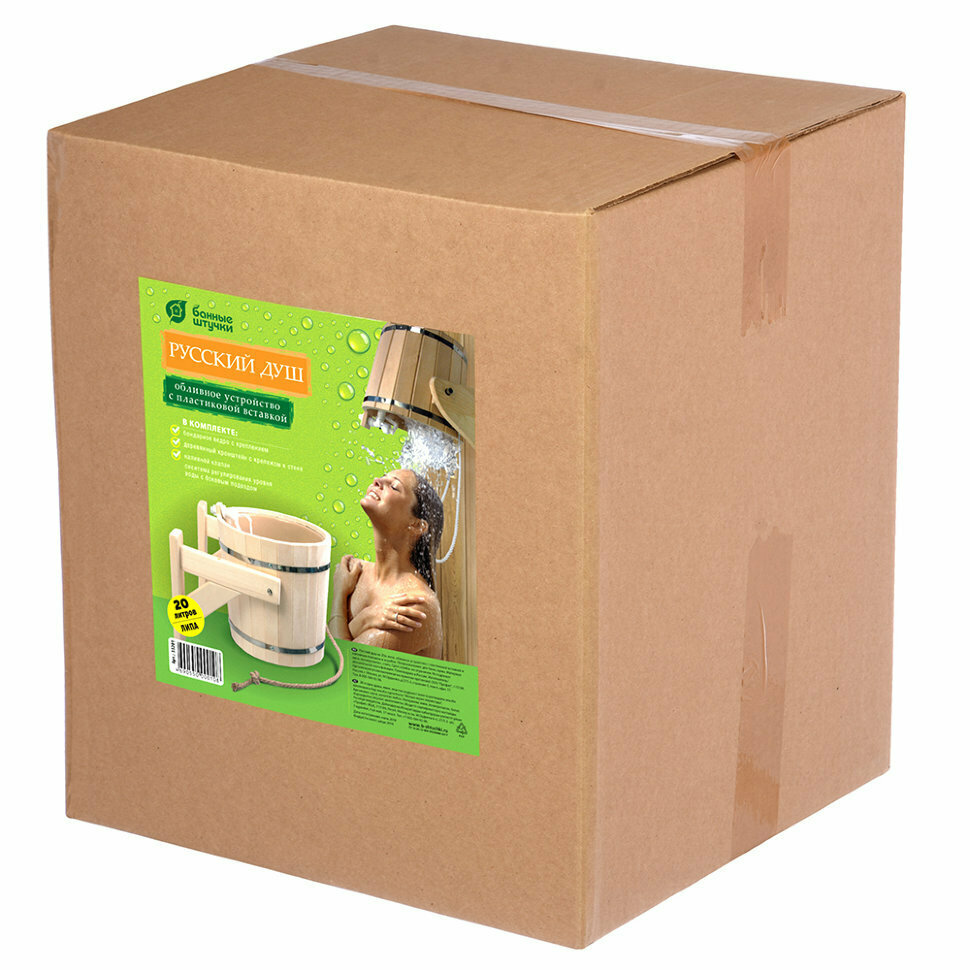 Русский душ на 20 л., липа, обливное устройство c пластиковой вставкой и наливным клапаном в коробке.ХарактеристикиРусский душ – не только практичный, но и полезный аксессуар для полноценной бани. Русский душ объемом 20 литров сделан из натуральной липы, а также имеет устройство с пластиковой вставкой и наливным клапаном в коробке. Это гарантирует экологичность изделия, его функциональность и отличный эстетический вид. Характеристики: Объем: 20 л. Материал: липа Обливное устройство с пластиковой вставкой и наливным клапаном в коробке