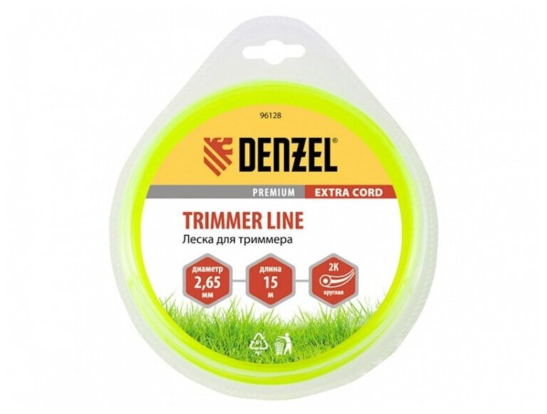 Леска Denzel Extra cord применяется в качестве режущего материала в мощных бензиновых триммерах. Леска круглой формы сечения изготовлена из двухкомпонетного материала: сердечник - из высокопрочного полиамида ТМ BASF, внешний слой - из высококачественного нейлона. В поставку входит блистер с леской длиной 15 м и диаметром сечения 2,65 мм. Благодаря двухкомпонентной структуре леска более прочна и устойчива к износу, имеет увеличенный ресурс работы - до 40 % по сравнению с традиционной леской. Применяется для скашивания густой и жесткой травы, молодого кустарника и бурьяна на запущенных участках.