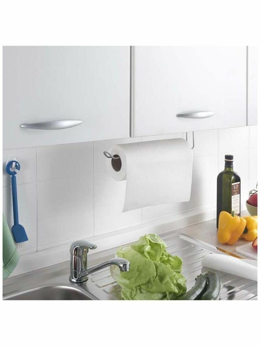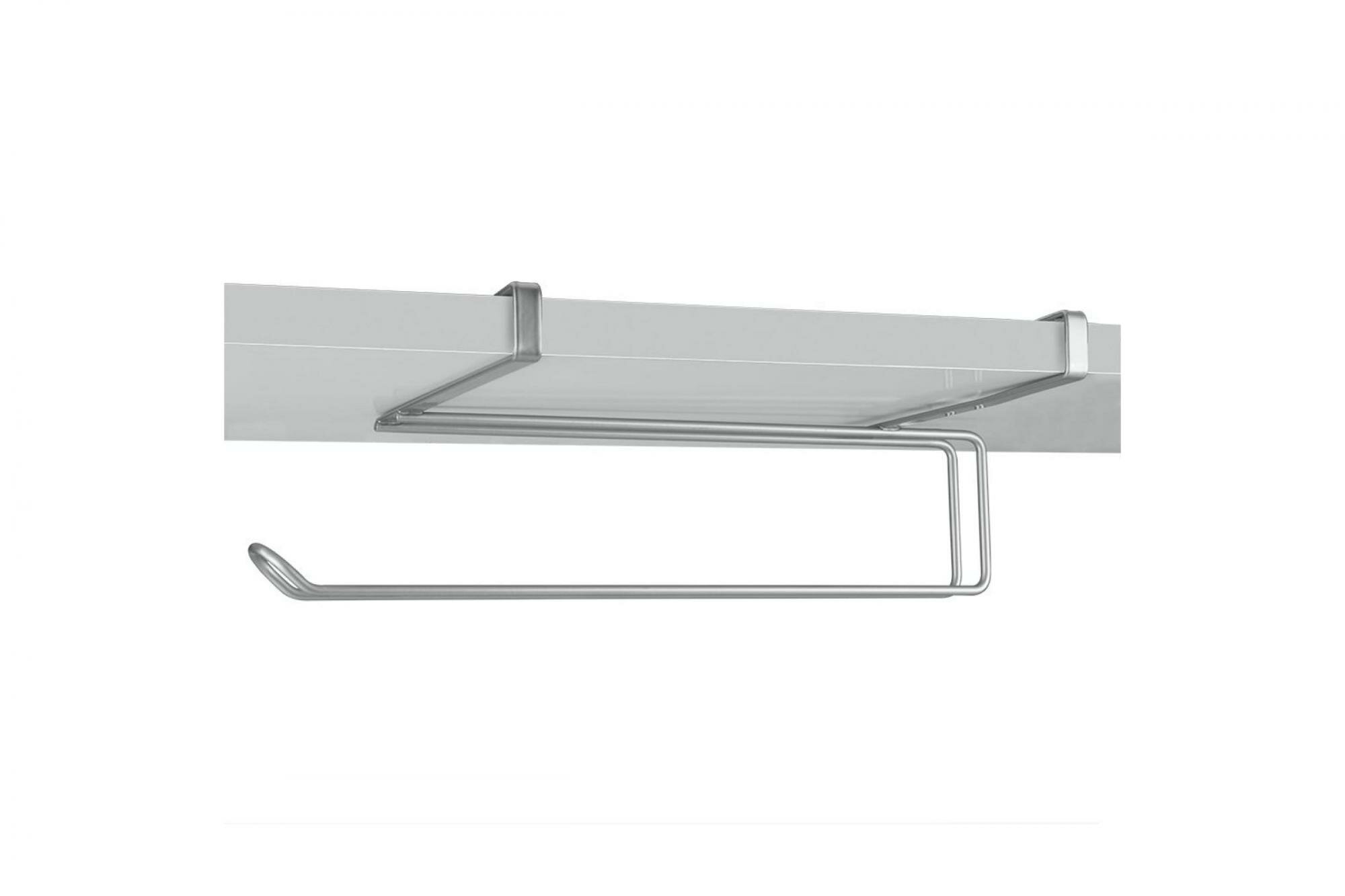 Предназначен для хранения бумажных полотенец в рулоне. Крепится на полку шкафчика без сверления. Конструкция выполнена из хромированной стали. Материал устойчив к коррозии, легко очищается от загрязнений.