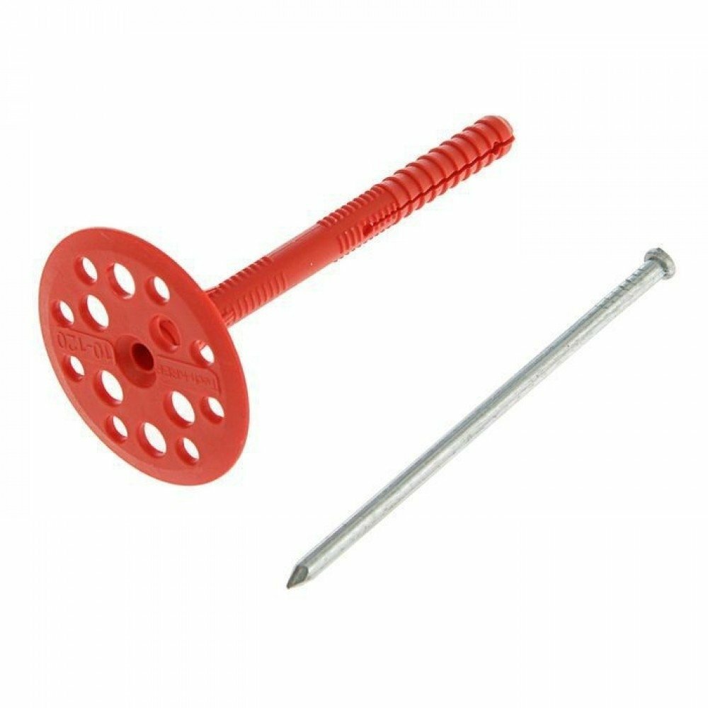 Широкую и плоскую шляпку. Она же «грибок», «тарелка», «парашют». Данная деталь крепления необходима для прижатия теплоизоляционного материала к стене Металлический оцинкованный гвоздь, вбивается в распорный элемент, чтобы обеспечить плотную фиксацию;