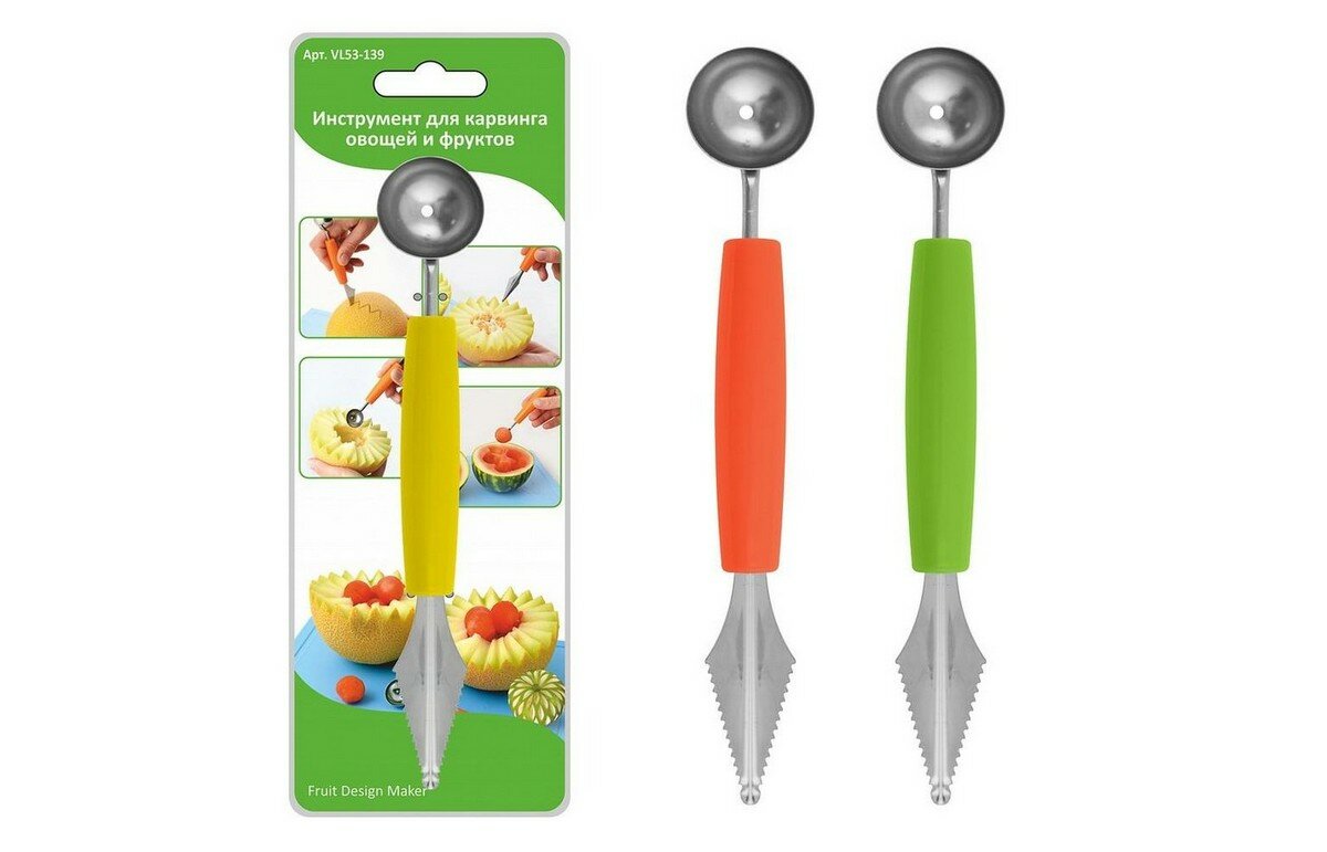 Инструмент для карвинга необходим для тех, кто хочет декорировать овощи и фрукты, превращая их в настоящие шедевры! С помощью него Вы сможете декорировать овощи и фрукты, превращая ваш сервированный стол в настоящее искусство!Инструмент представляетсобой карбовочной нож V-образной формы с одной стороны и ложку-нуазетку с другой стороны. Карбовочные ножи V-образной формы используются для вырезания канавок и выемок, а ложки-нуазетки - для выемки мякоти из крупных плодов, вырезания шариков и полусфер.