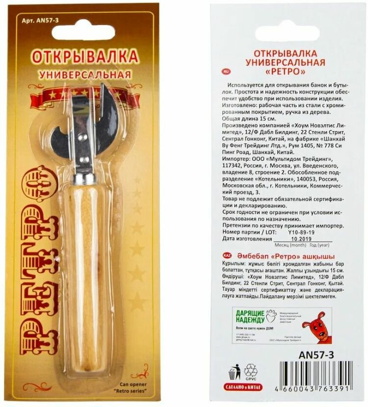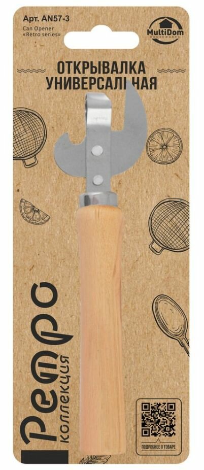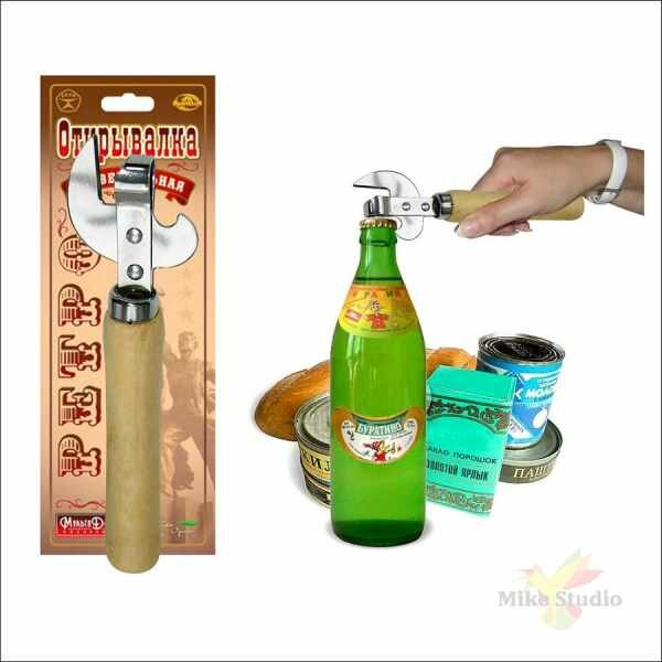 Советская ретро-концепция в домашней утвари знакома всем с детства. Открывалка станет незаменимым помощником для вскрытия банок с консервами и бутылок. В отличие от многих современных моделей, ретро-открывалка не имеет сложных механизмов. Открывалка проста в использовании. Рабочая часть открывалки изготовлена из стали с хромированным покрытием, ручка из дерева. Сталь не портится при взаимодействии с пищей и долговечна, деревянная ручка удобно лежит в руке. Приспособление не требует особого ухода, ее достаточно промыть в проточной воде с использованием губки.