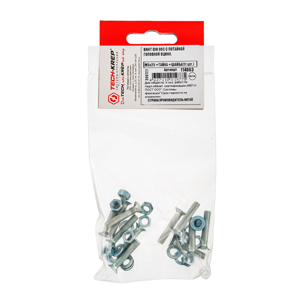 винт din965 с потайной головкой оцинк. m5х25 + гайка + шайба (11 шт) - пакет 114063 Tech-Krep