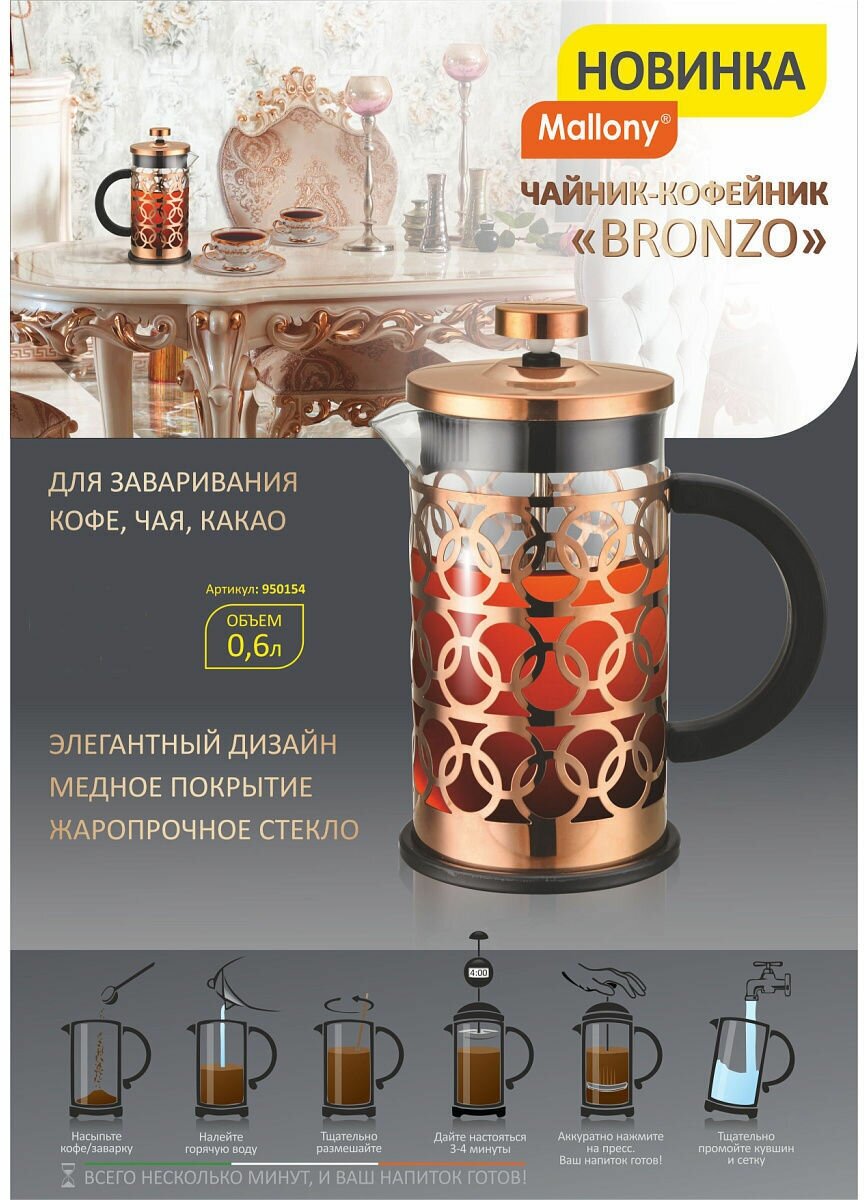 На сегодняшний день товар «френч-пресс 600мл mallony bronzo стеклянный в корп из нерж стали 950154 Bronzo 950154 (0,6 л)» можно купить с кешбеком в 1 магазине: Onliner BY