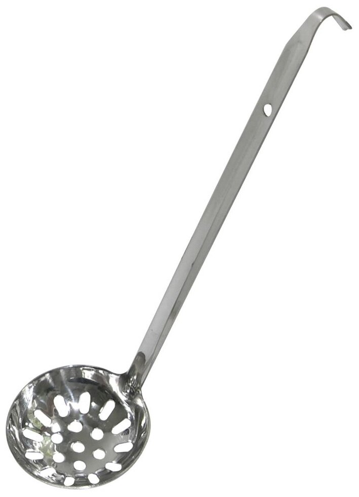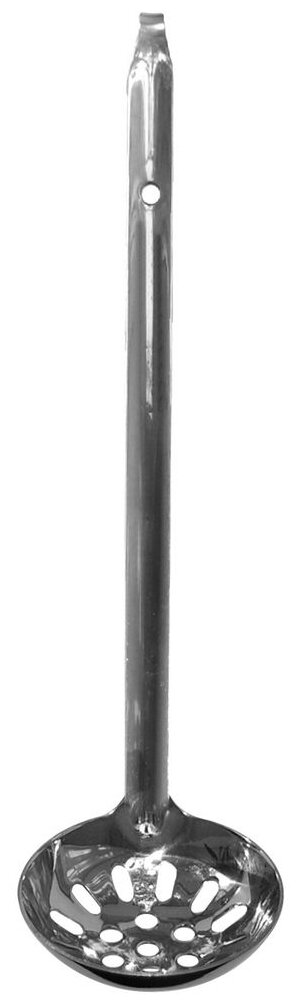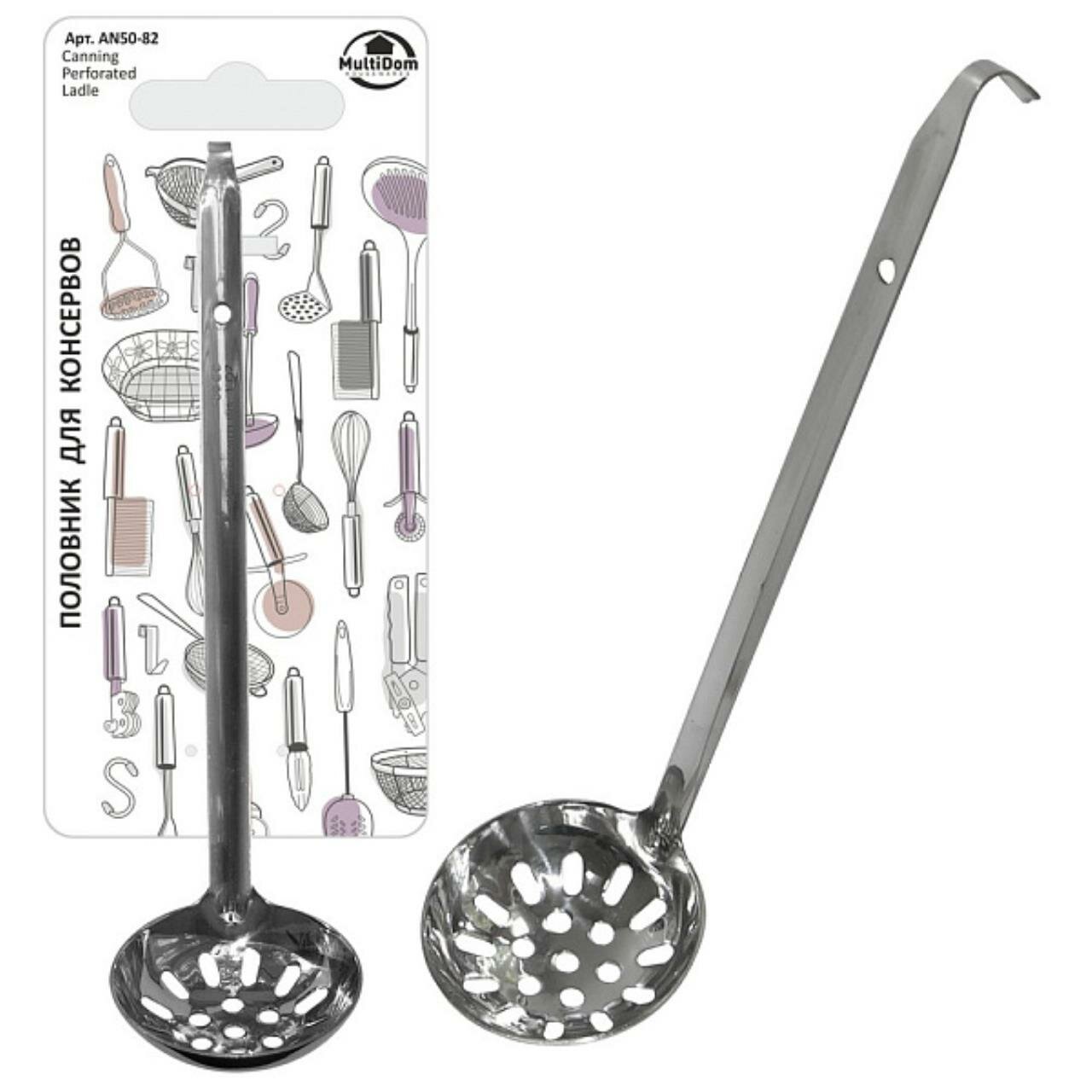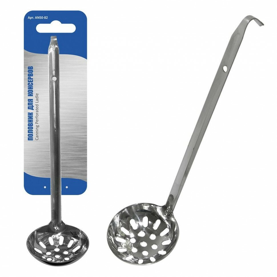 Консервы составляют довольно большую часть рациона в повседневном питании. Консервированные овощи становятся частью салата, соленья выкладывают на столы во время застолья, а некоторые продукты консервируют для того, чтобы они дольше хранились. С половником для консервов вам будет проще извлечь консервированные продукты из стеклянных или металлических банок. Длинная ручка позволит достать продукты даже со дна емкости, а наличие отверстий позволит лишней воде вытечь обратно. Изделие легко моется,не впитывает запахи. Изготовлено из стали с хромированным покрытием. Длина 29 см.