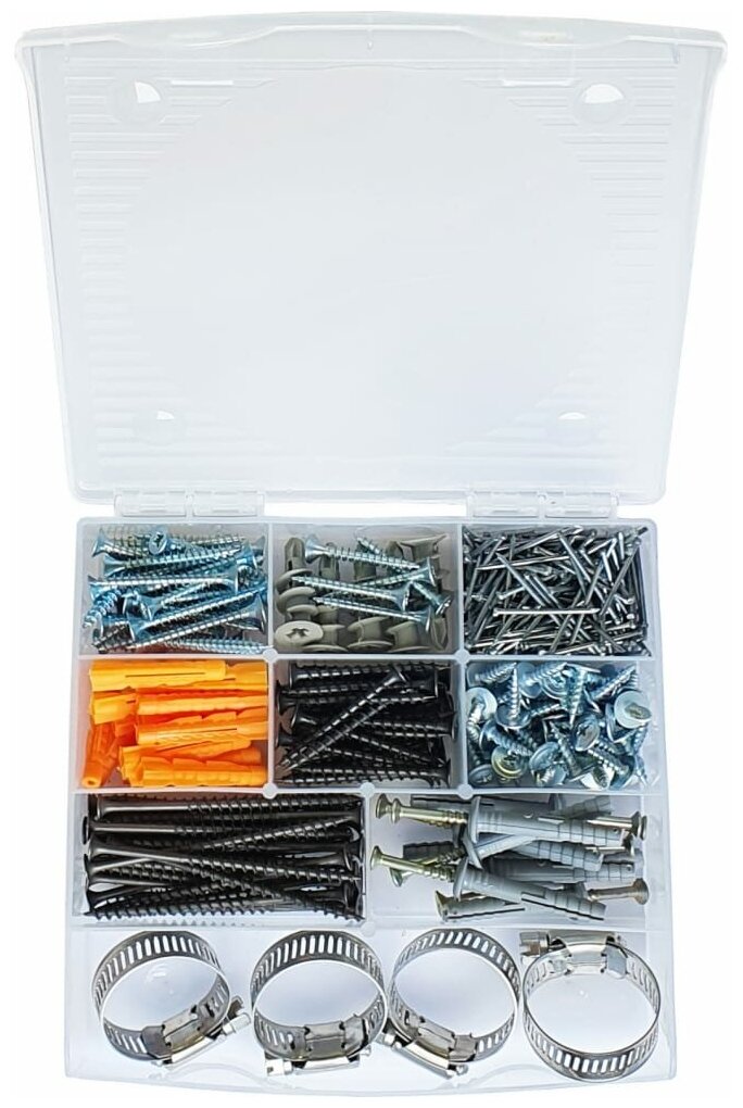 | Цвет | Комплект «Всё для дома» включает в себя весь необходимый крепёж для монтажа деревянных и металлических изделий В состав комплекта входят: - дюбель-гвозди с грибовидной манжетой из полипропилена SM-G 6,0х40 мм (10 шт.); - саморезы гипсокартон-дерево 4,2х75 мм (30 шт.); - саморезы металл-металл 4,2х16 мм (60 шт.); - саморезы гипсокартон-дерево 3,5х45 мм (30 шт.); - саморезы универсальные оцинкованные 4,5х35 мм (10 шт.); - саморезы универсальные оцинкованные 4,5х40 мм (35 шт.); - дюбели распорные ZUM из полипропилена 6,0х37 мм (20 шт.); - нейлоновые дюбели со сверлом для гипсокартона DRIVA PA 14,0х32 (10 шт.); - хомуты обжимные из нержавеющей стали 20-32 мм (4 шт.); - гвозди финишные оцинкованные 1,6х30 мм (100 г). |