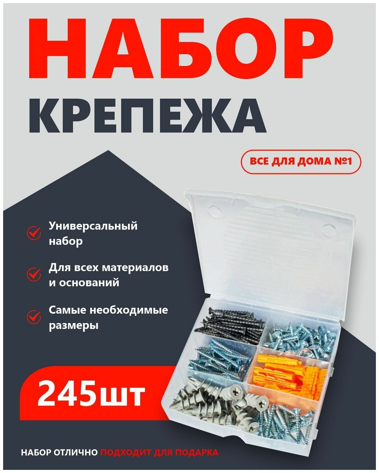 | Цвет | Комплект «Всё для дома» включает в себя весь необходимый крепёж для монтажа деревянных и металлических изделий В состав комплекта входят: саморезы универсальные оцинкованные 4,5х35 мм (20 шт.); - саморезы универсальные оцинкованные 4,5х40 мм (40 шт.); - саморезы металл-металл 4,2х16 мм (80 шт.); - саморезы гипсокартон-дерево 3,5х45 мм (50 шт.); - нейлоновые дюбели со сверлом для гипсокартона DRIVA PA 14,0х32 мм (20 шт.); - дюбели распорные ZUM из полипропилена 6,0х37 мм (35 шт.). |
