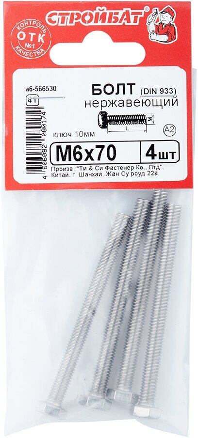 болт с шестигранной головкой нерж. ст. полн. рез. 8х30 а2 (4шт) din933 ПАРТНЕР