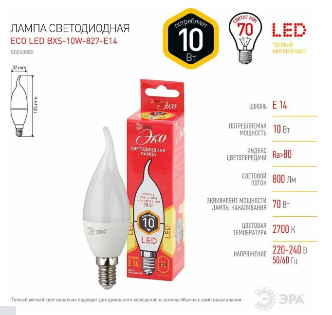 На сегодняшний день товар «Светодиодная лампа Е14 10W 2700К (теплый) Эра ECO LED BXS-10W-827-E14 (Б0040885)» можно купить с кешбеком в 1 магазине: Яндекс.Маркет