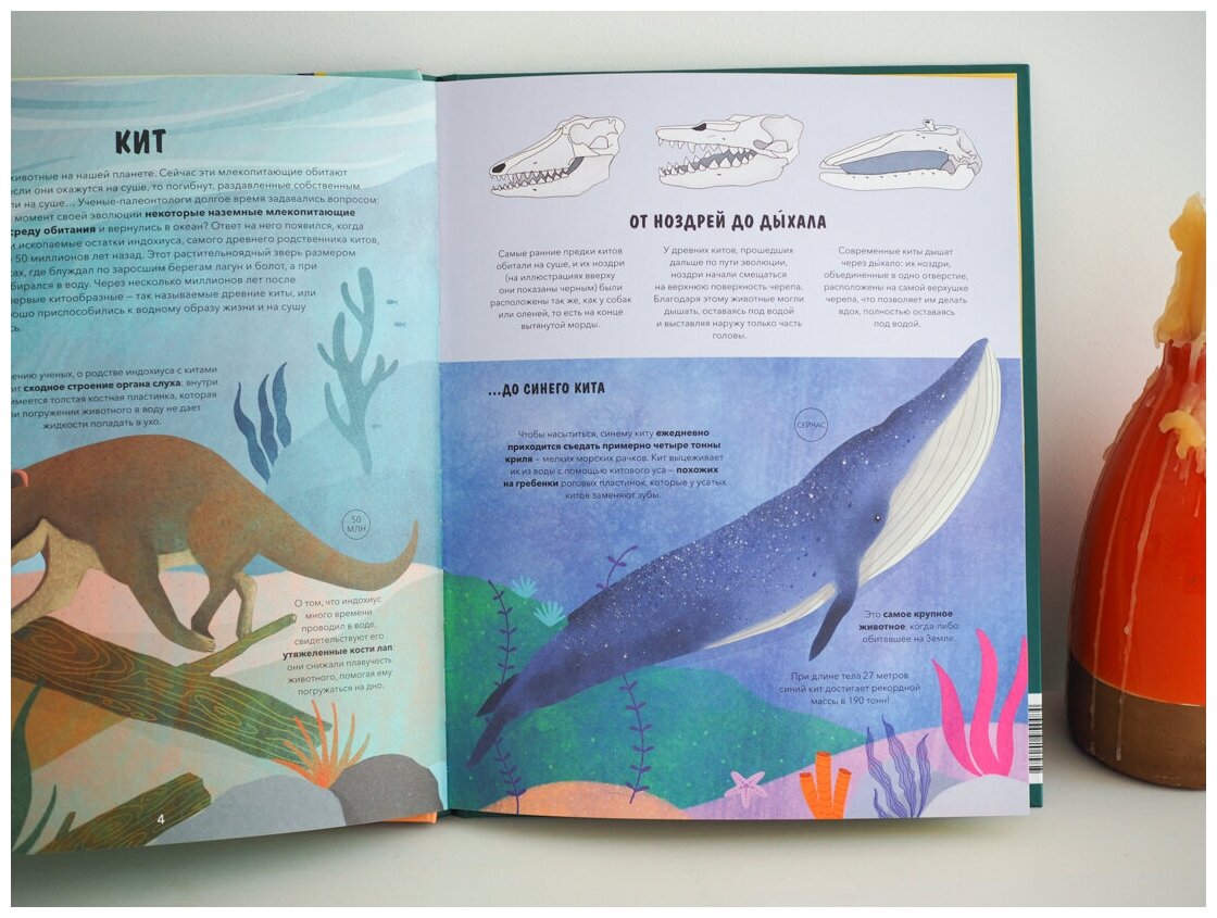 Интересная познавательная новинка издательства МИФ, рассказывающая об эволюции человека и некоторых позвоночных животных (от кита до черепахи). Каждой группе животных отведено два разворота: на первом описывается существующее современное животное и его самый дальний родственник, от которого оно произошло, их особенности, а на втором развороте рассматривается вся оставшаяся эволюционная линейка животных с кратким описанием эволюционных изменений. Возле каждого животного указано время существования, например, предок кита - индохиус (кстати, который совсем ни капельки не похож на кита) жил на Земле около 50 млн лет назад. Само издание увеличенного формата, напечатано на плотном офсете, отлично проиллюстрировано.