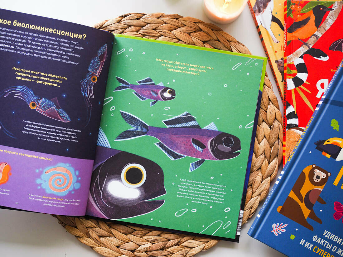 Оказалось, что книга рассчитана на более младший возраст, чем остальные книги из этой серии, небольшое количество доступной к пониманию ребенком информации, симпатичные иллюстрации, вполне можно рассматривать и читать лет с 5-и. Если бы не обилие встречающихся терминов "(биолюминесценция", "люциферины" и "иллиций" и т.д.) можно было бы рекомендовать читать книгу лет с 3-х. По формату издание немного меньше других книг серии, видмимо, чтобы детским ручкам было удобнее держать, бумага офсет, достаточно плотная. Шрифт по размеру разный, расположен, в основном, на более темном фоне, но вполне читабельный.