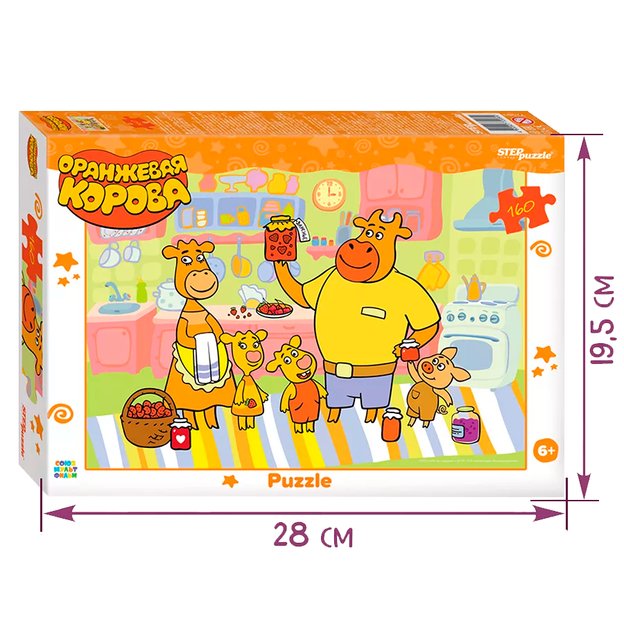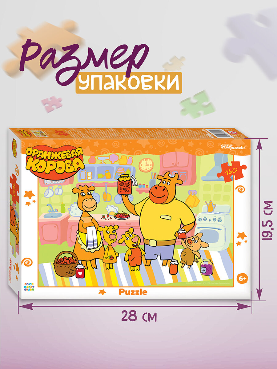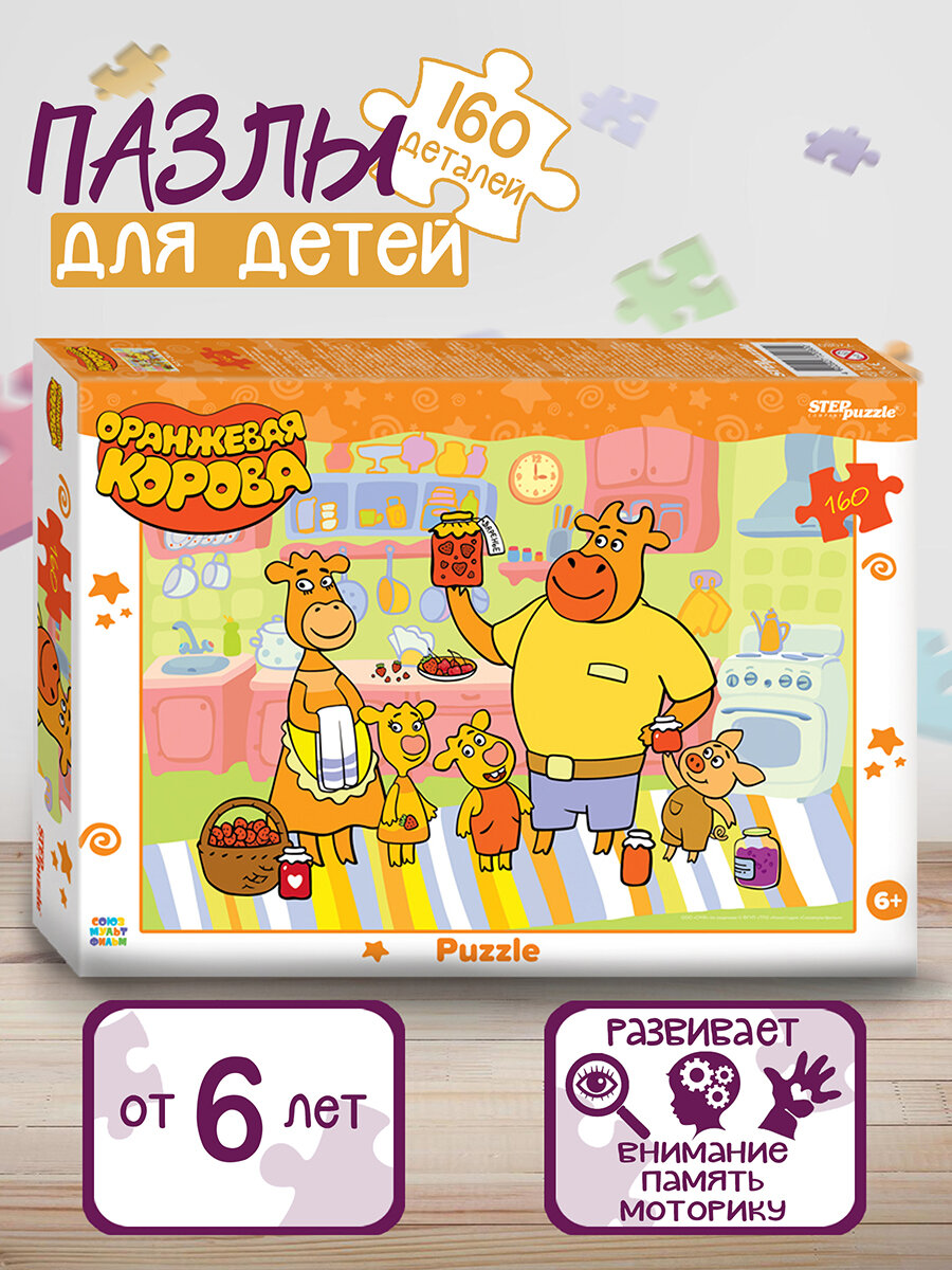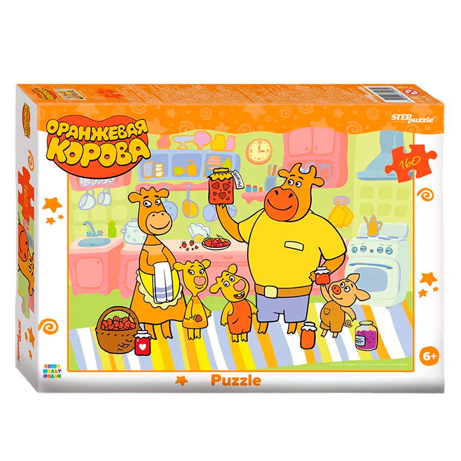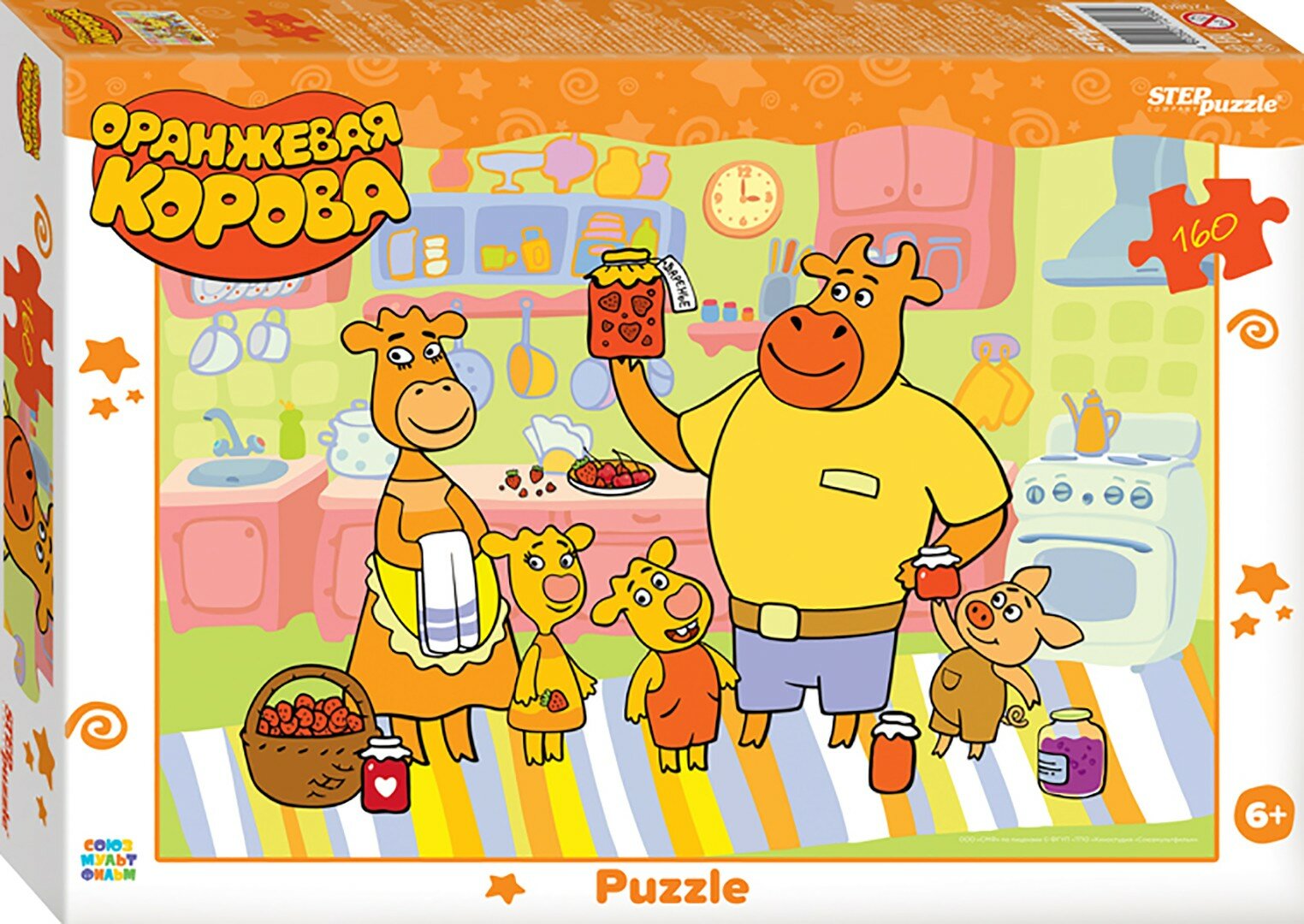 Пазл «Оранжевая корова» состоит из 160 деталей. На его картинке мы видим пятерых главных героев: Маму Корову и папу Быка, Бо, Зо иих друга поросенка Колю.