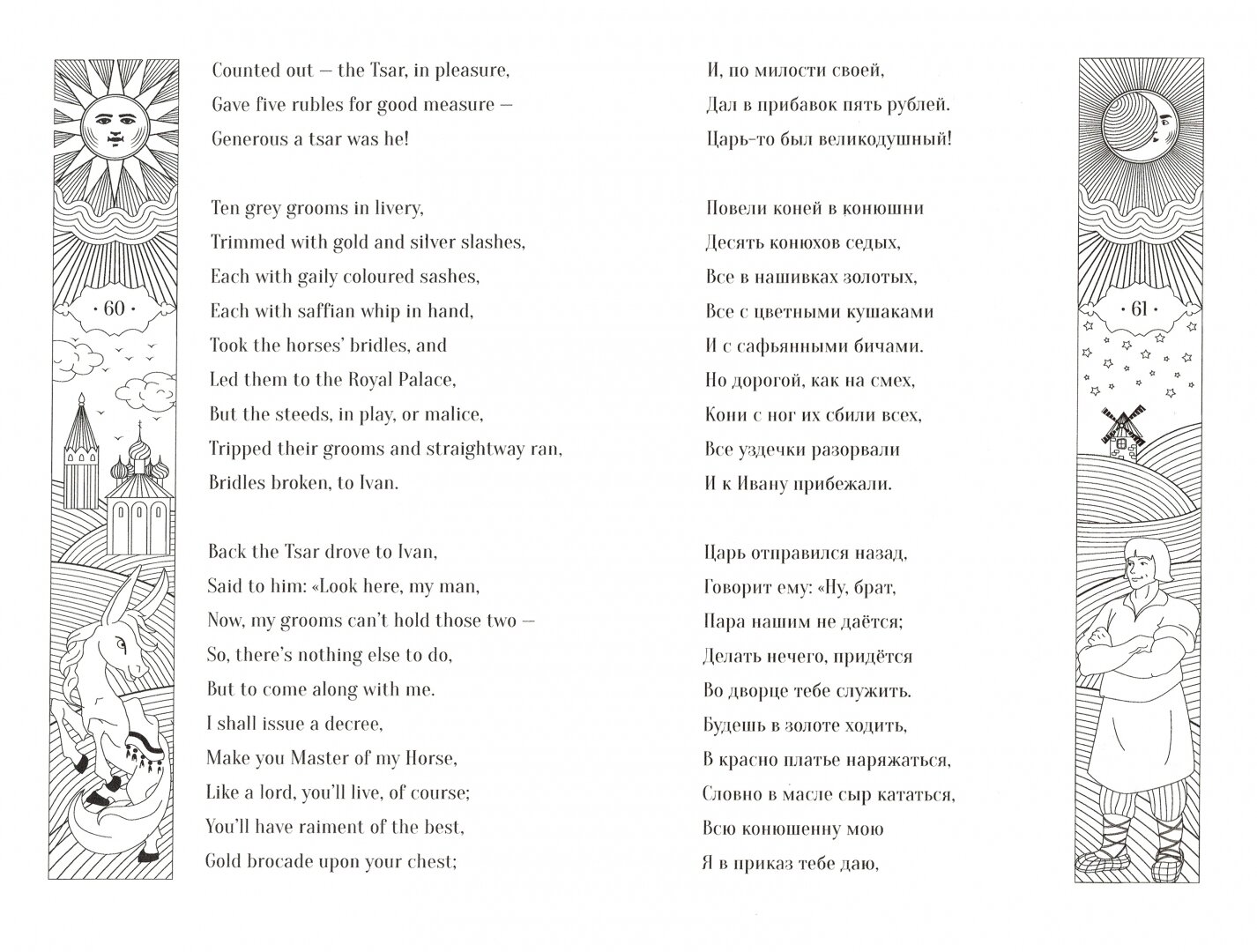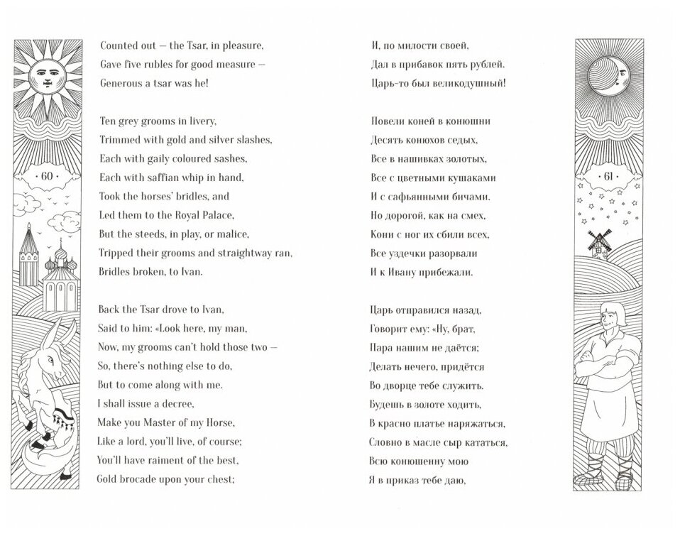 В книге-билингве оригинальный текст на русском языке дополнен параллельным переводом на английский. Перевод сохраняет легкость стиха оригинальной сказочной поэмы, его выполнил Лев Моисеевич Зеликов. Это образцовый перевод, прошедший проверку временем: первое его издание появилось в 1954 году в «Детгизе».