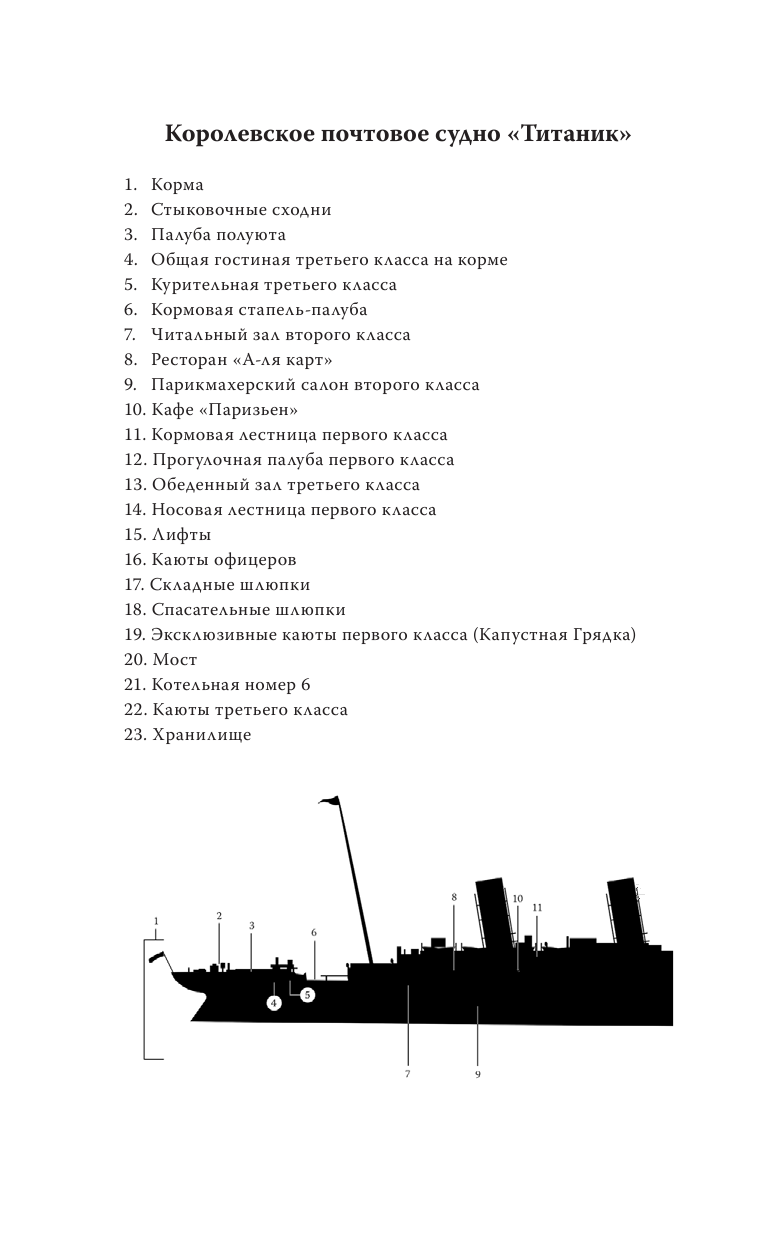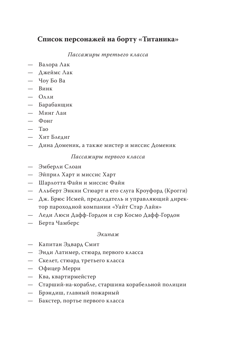 Самое сложное в написании книги по мотивам исторических событий - это удержать выдуманные события в реальных рамках и в процессе не нанести ущерб достоверности. Там, где по моим ощущениям, это было важно, я давала своим персонажам имена реальных пассажиров, в основном для того, чтобы сподвигнуть читателей узнать о них больше. Само собой, некоторые обитатели судна просто должны были сохранить свои имена: капитан Смит, Дж. Брюс Исмей, Дафф-Гордоны. "Титаник" не был бы "Титаником" без них.