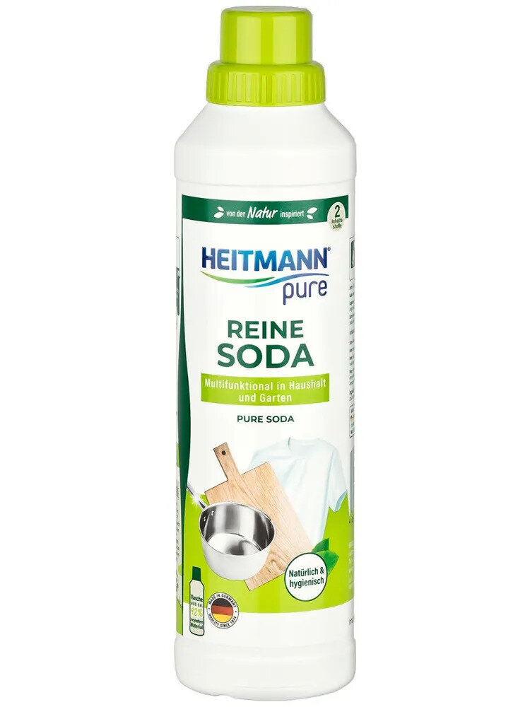 Натуральное многофункциональное чистящее средство HEITMANN для применения дома или в саду, например, для ухода за бельем, а также для чистки и уборки. Удаляет жир, грязь и пятна, сгоревшие остатки пищи в кастрюлях и на противнях, а также различные запахи. Устраняет зеленые отложения на каменных плитах, деревянных заборах и садовой мебели, а также известковые отложения с краев цветочных горшков. Специальный колпачок бутылки позволяет просто и удобно дозировать средство. Не использовать на чувствительных к щелочи поверхностях, например, мраморе.Очень прост и практичен в применении и сразу готов к использованию: его не нужно предварительно растворять и высчитывать пропорции, производитель уже сделал это за вас.- Полностью натуральное средство- Готово к использованию- 2 ингредиента в составе- Растворяет жир, грязь и пятна- Удаляет зеленые отложения с каменных плит и садовой мебели