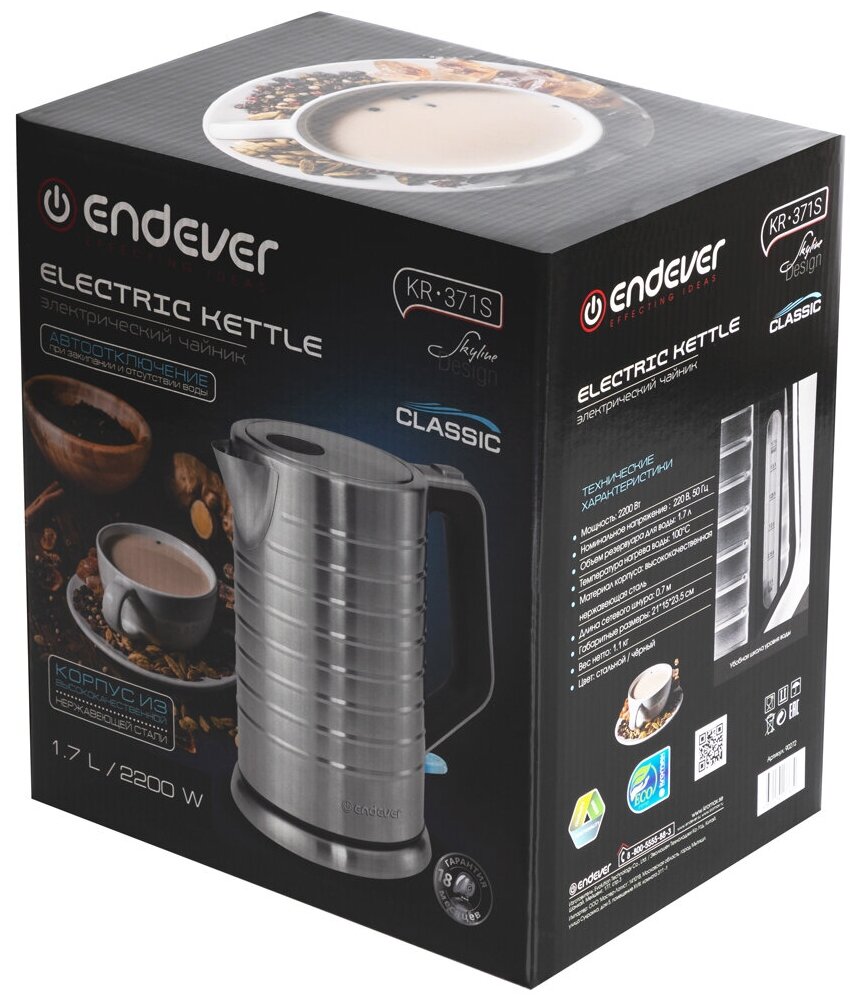 Красивый дизайн и приятный яркий внешний вид электрического чайника Endever Skyline KR-271S позволит ему занять достойное место на любой кухне и идеально вписаться даже в самый изысканный интерьер. Высокая мощность устройства дает возможность быстро и качественно вскипятить большой объем воды, рассчитанный на 1,7 литров, благодаря чему даже большая и многочисленная семья может собраться вместе за одним столом на чаепитие.Корпус электрического чайника Endever Skyline KR-271S выполнен из высококачественной нержавеющей стали, которая послужит гарантом долговечности использования и сохранит оригинальный вкус вскипяченной воды (без посторонних запахов и привкуса).Дополнительными функциональными особенностями модели являются также двухсторонняя индикация уровня воды со шкалой, скрытый и безопасный нагревательный элемент, съемный фильтр-сетка, не пропускающий частицы накипи, и световой индикатор включения.