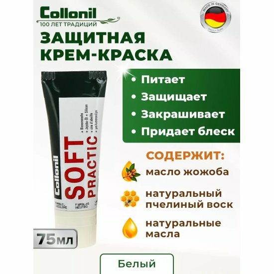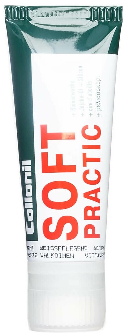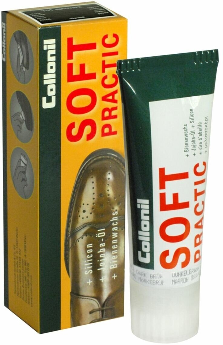 Крем Soft Practic для ухода за обувью из деликатной и чувствительной гладкой кожи. Масло жожоба ухаживает за кожей и смягчает ее, пчелиный воск защищает от влаги и глубоких загрязнений, придает изделию элегантный блеск.