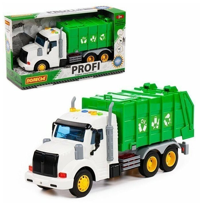 Автомобиль коммунальный инерционный «Профи» от фабрики «Полесье» - это качественная реалистичная игрушка, конструкция которой полностью повторяет дизайн настоящей техники. Спецмашина имеет три пары колёс на металлических осях, кроме того, она оснащена кузовом с задней загрузкой, который позволит придумывать различные сценарии игры. На кабине авто имеется 4 кнопки управления звуковыми и световыми эффектами.